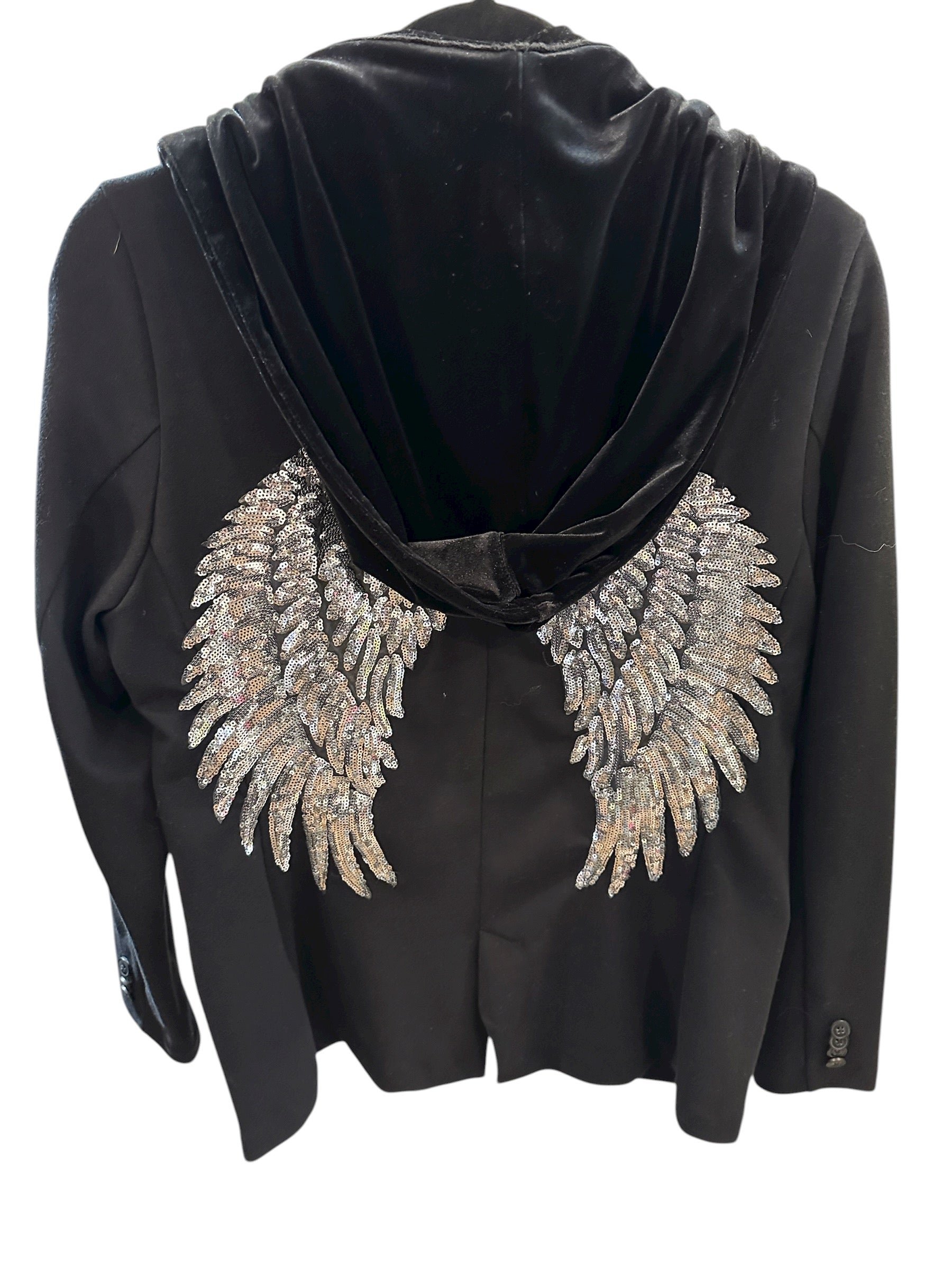 Take your look to celestial heights with this black fitted blazer featuring an eye-catching velvet hood and dazzling sequin angel wings on the back. The blend of luxe textures and bold detailing makes this piece a true standout — part jacket, part statement art.