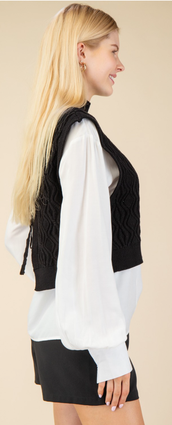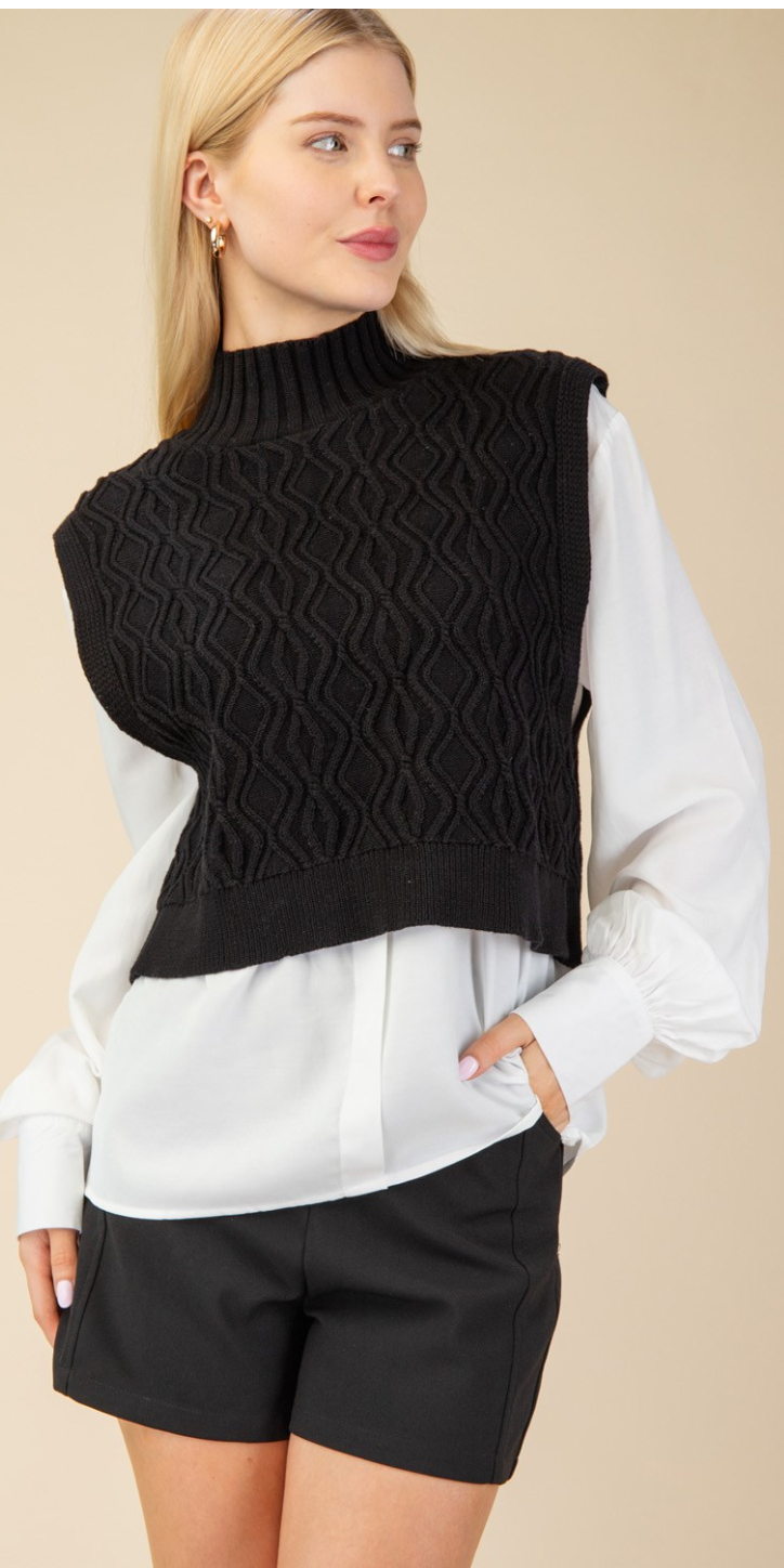 Get the layered look—without the bulk! This mock neck sweater vest over a crisp white top gives the illusion of two pieces in one. Perfect for styling with dress pants, joggers, or skirts, it’s an effortlessly chic combo that transitions seamlessly from workday polish to weekend cool.