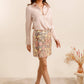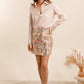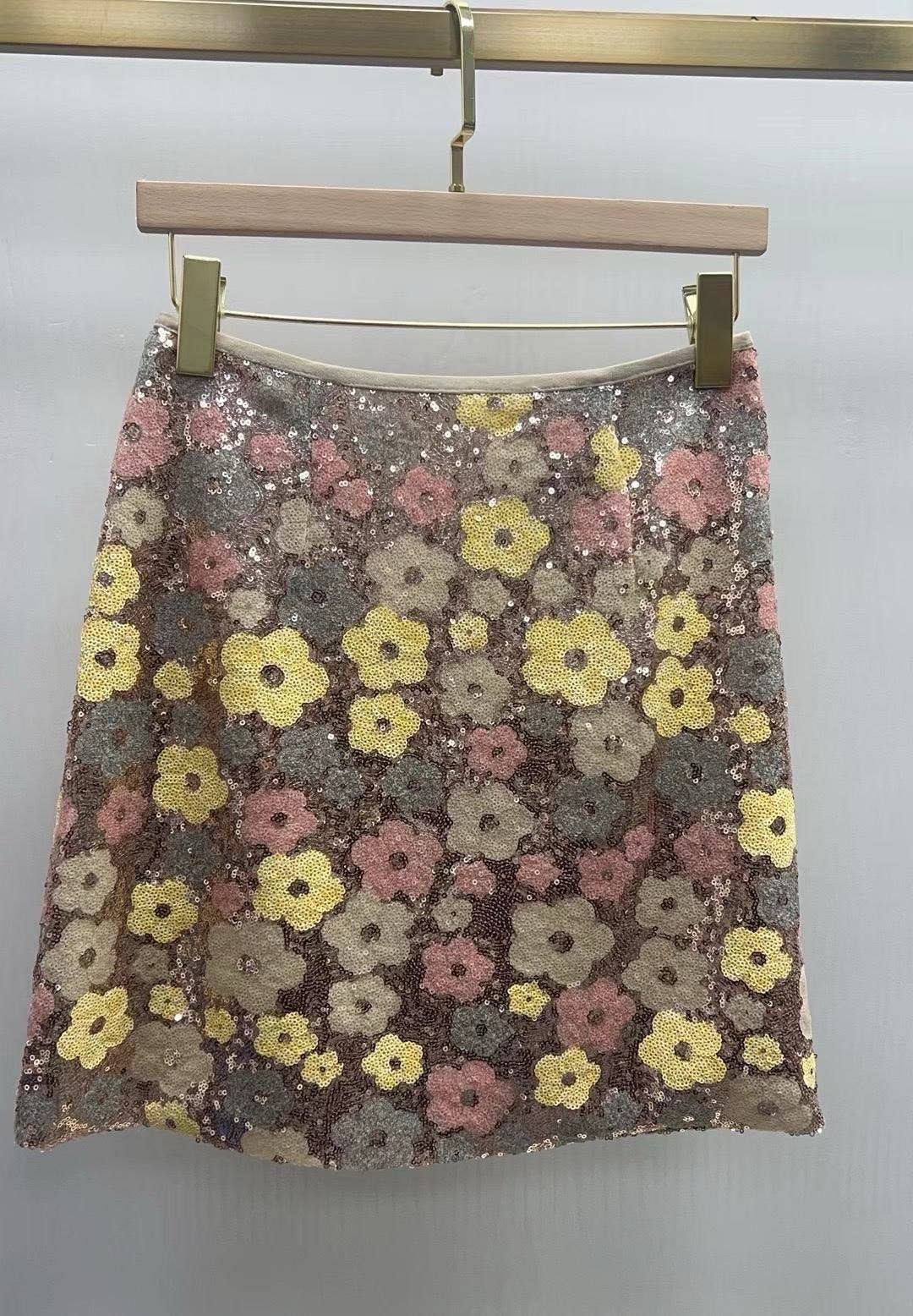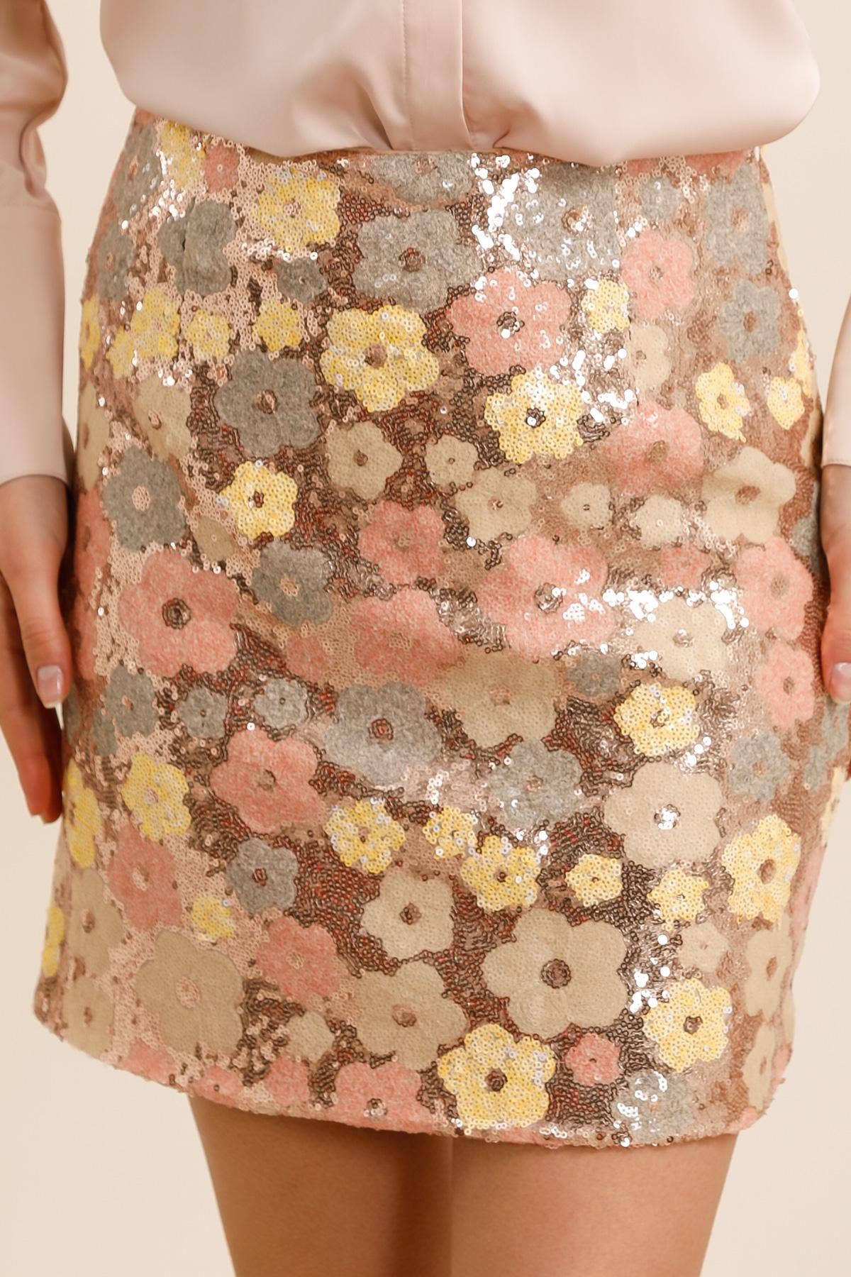 Floral multicolored sequin short skirt: - Inner lining - Elastic waistband - Back zip closure - Straight shape - Multicolored floral sequin pattern Skirt length: 84cm Look pairing. Our model is 1.75m tall and wears size S.