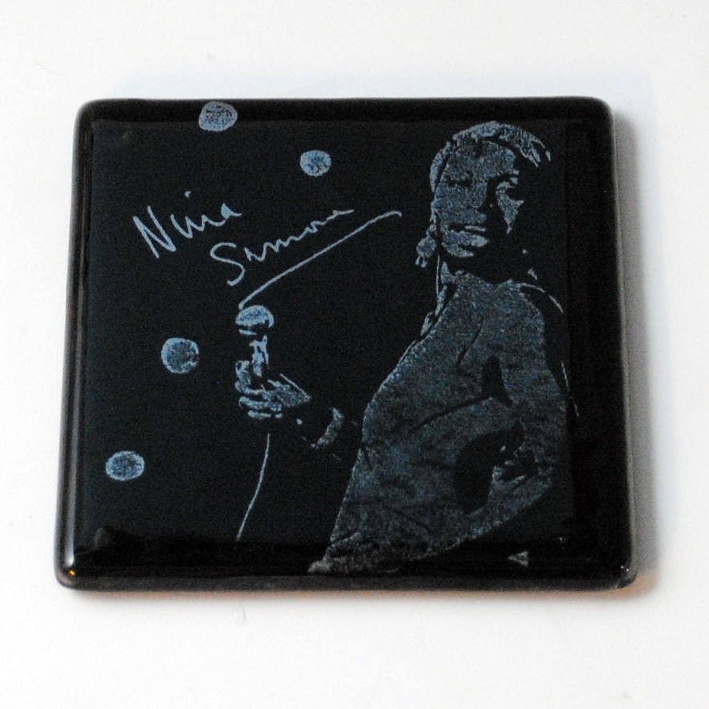 Nina Simone Fused Glass 4" Single Coaster, Barware, Handmade. Pop-culture Icons screen printed on colorful sheet glass then fused in a kiln. 4x4" coasters are screen printed, fused glass with rubber bumpons affixed to the bottom to protect your surfaces.
