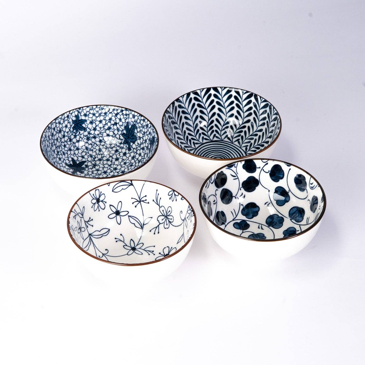 Timeless and refined, this four-piece rice bowl set showcases classic Japanese Nippon blue patterns, each with its own distinctive hand-inspired design. The contrasting motifs create a beautiful collected look while still feeling cohesive as a set.