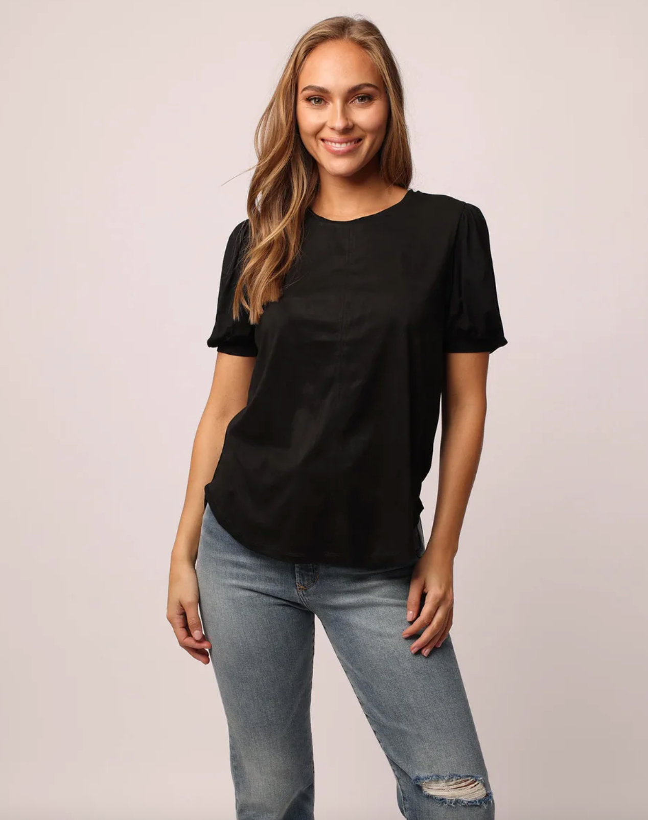 Short bubble sleeve with mixed suede knit top body. Feels amazing. What a great basic! 90% spandex 10% Poly Sleeves body is 95% Rayon 5 % Spandex