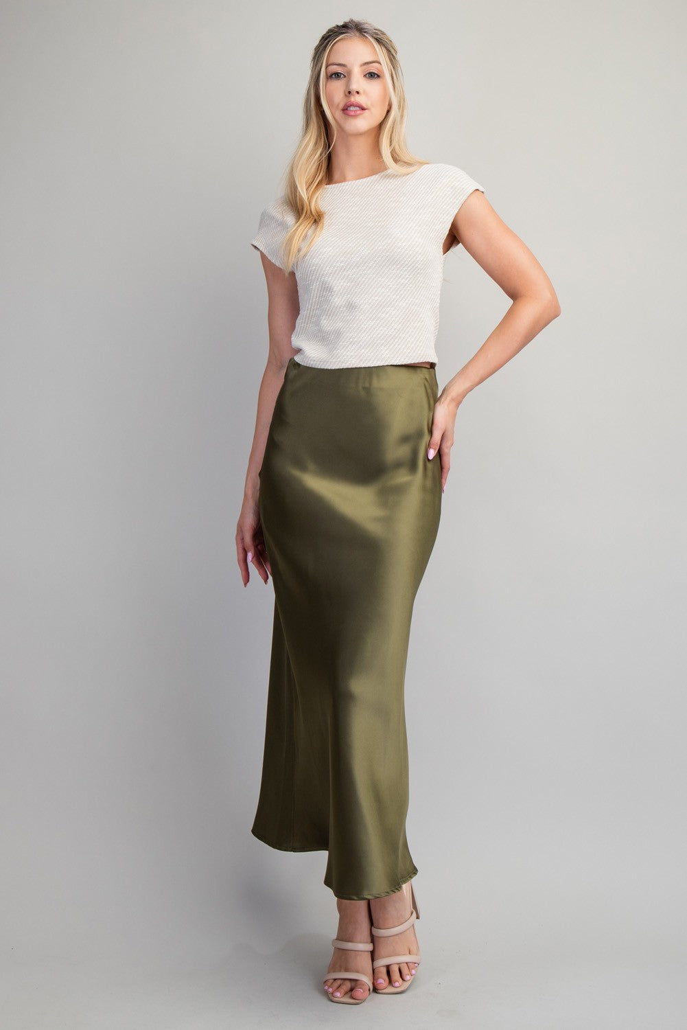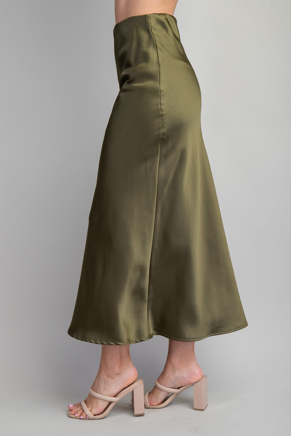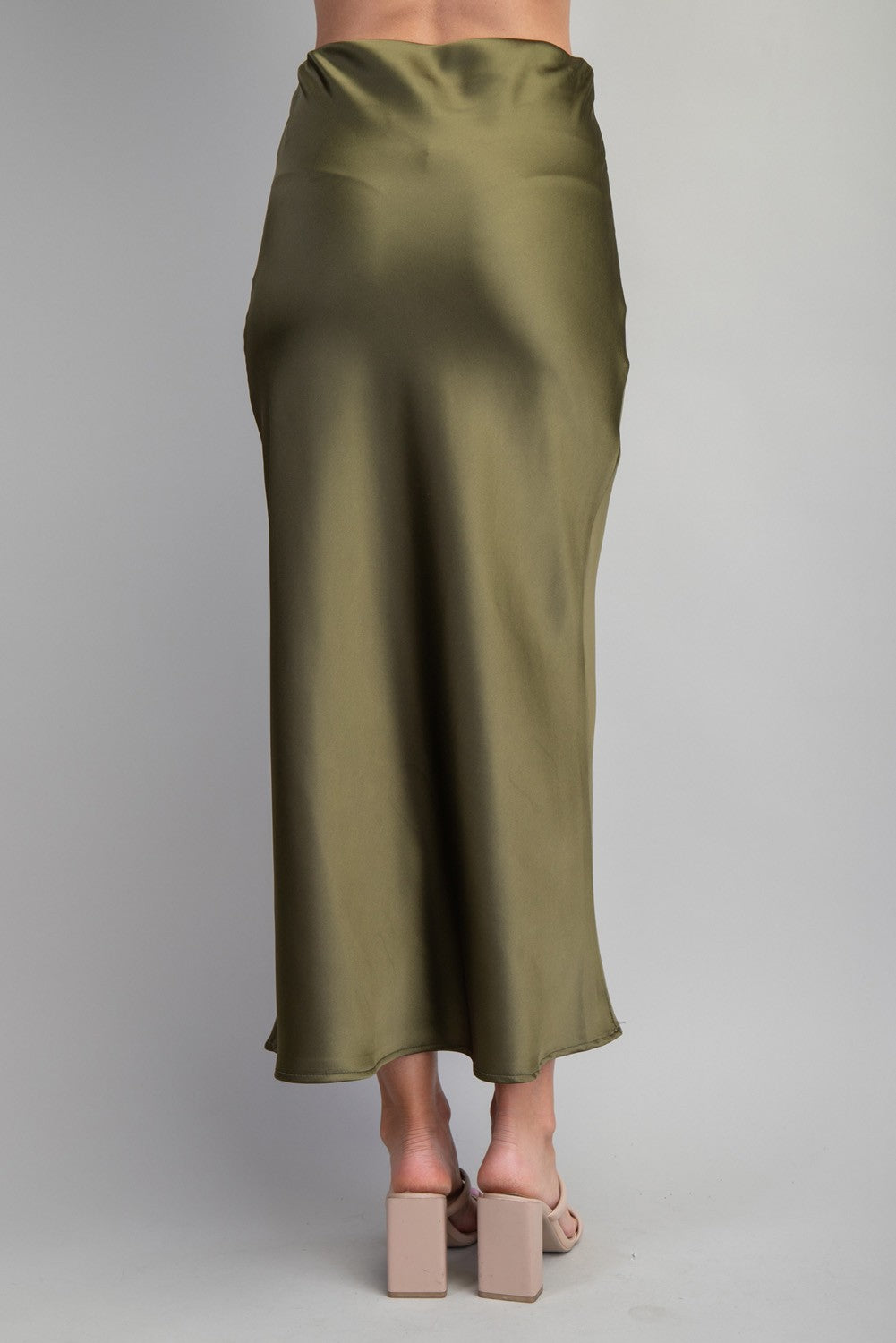 Gorgeous satin olive midi skirt.  Pair with t-shirts, blouses or sweaters.  Perfect for work or party.