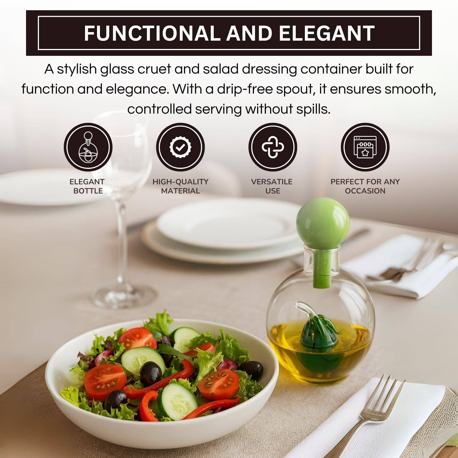 Elevate your kitchen with this olive oil cruet, a stylish glass cruet and salad dressing container designed for both function and elegance. Featuring a drip-free pour spout, this durable cruet ensures smooth and controlled serving without spills. Crafted from clear glass with a 10.15 oz capacity, it works as a reliable storage jar for olive oil, balsamic vinegar, sauces, or homemade infusions. Its modern design blends seamlessly with tableware and home decor, making it a versatile cooking tool and functional dining server. Perfect as a gourmet gift, this elegant vessel enhances everyday meals while doubling as a tasteful centerpiece.