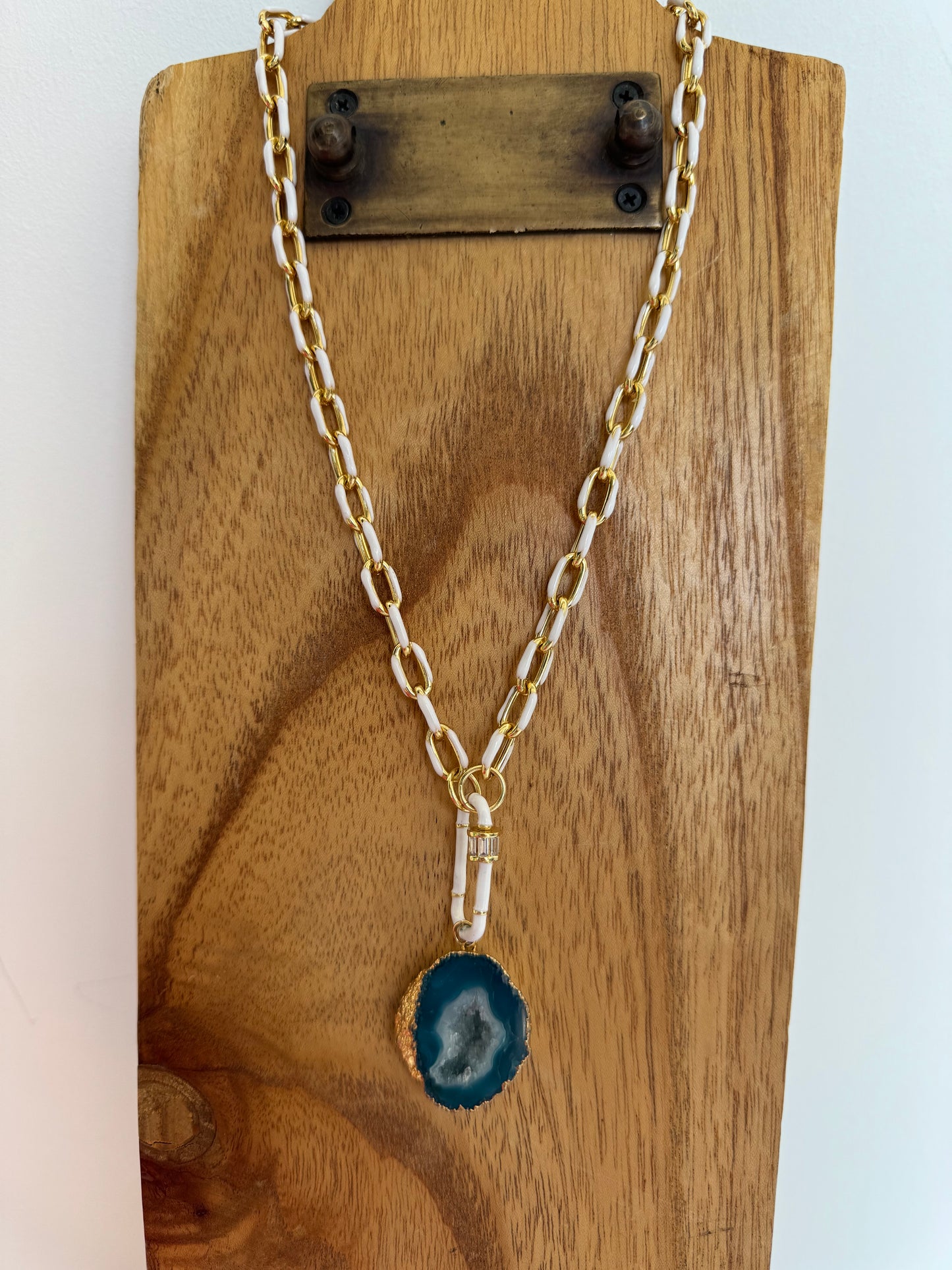 Enamel Paperclip chain with screw pendant and a blue druzy! This piece is so beautiful. This necklace is 11 in long
