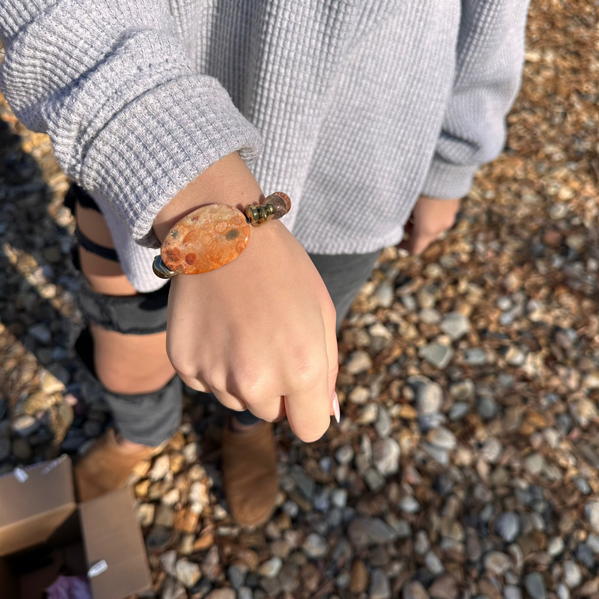 Everyone wants to make a Statement. This Bracelet will make that happen. Orange Colored Fossilized Coral with Gold Hematite Beads and Ghost Jasper Beads. Each Bracelet Stretches will fit most wrists.
