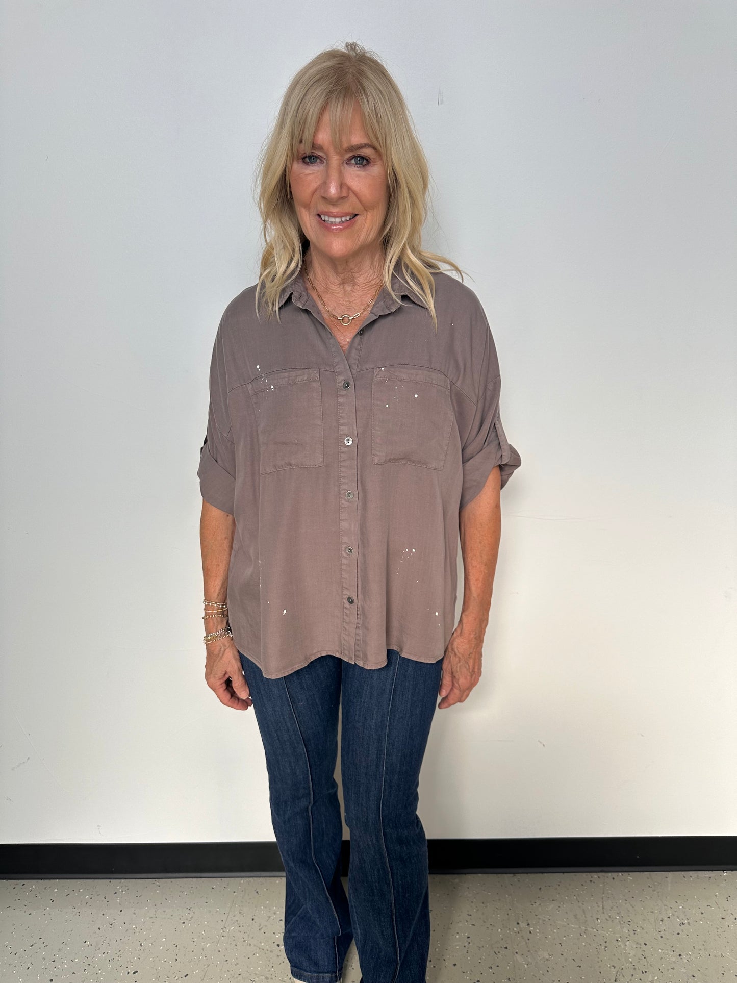 This Tencel button-down shirt combines comfort and style with a trendy twist. Crafted from soft and eco-friendly Tencel fabric, it offers a luxurious feel against the skin. The unique paint splatter design adds a pop of artistic flair, infusing personality into your ensemble. With rolled sleeves, it exudes a relaxed vibe while still maintaining a polished look. The addition of pockets not only enhances functionality but also adds a touch of utility-inspired charm. Whether dressed up with tailored pants or dressed down with jeans, this shirt is a versatile wardrobe essential that effortlessly blends fashion-forward aesthetics with everyday comfort.