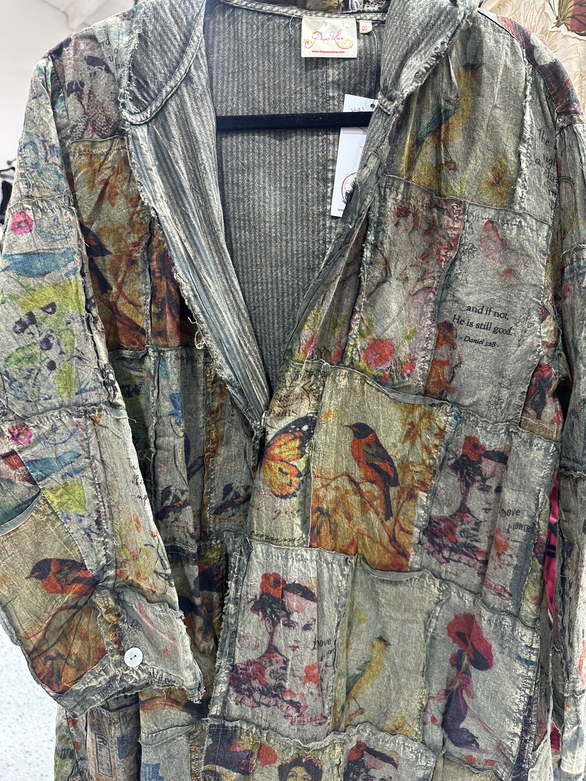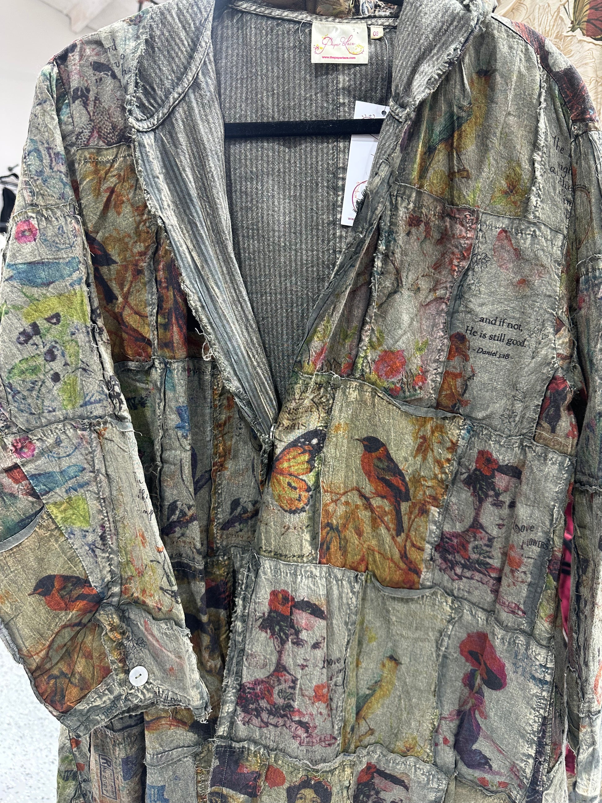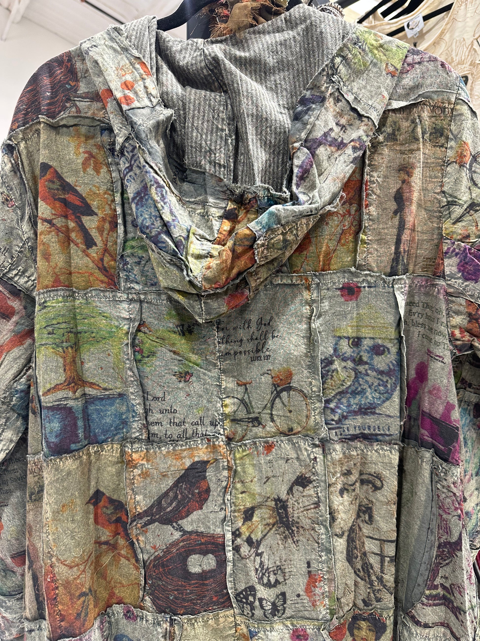 Wrap yourself in effortless artsy charm with this high-low hooded jacket by Paper Lace. A vibrant mix of green and plum patchwork gives it that signature boho-chic personality, while the soft, lightweight fabric makes it a perfect throw-on layer year-round. The relaxed one-size silhouette drapes beautifully, flowing longer in the back for a touch of drama. Finished with a cozy hood and raw-edged detailing, it’s the ideal statement piece for elevating everyday outfits with creative, free-spirited style.