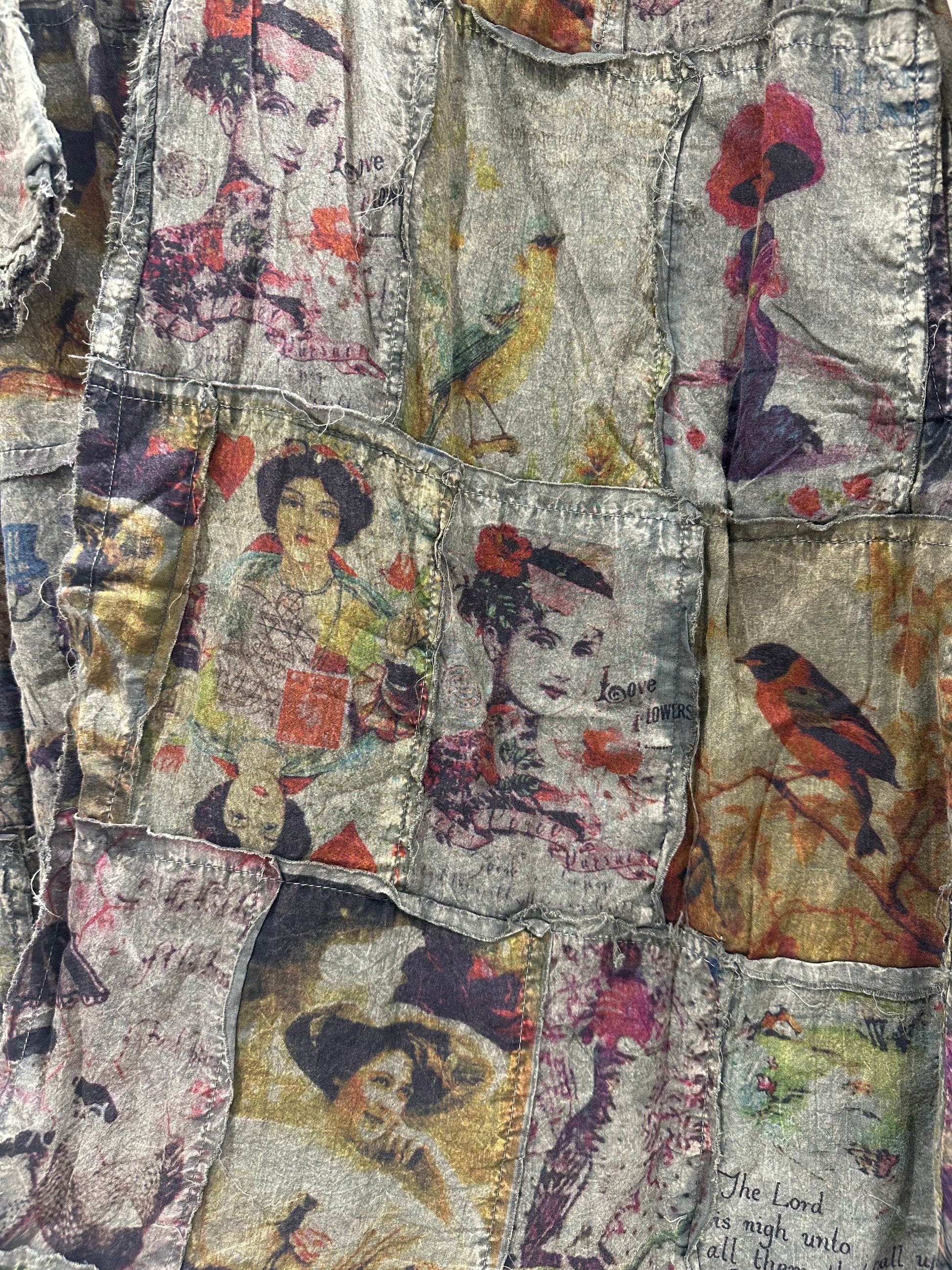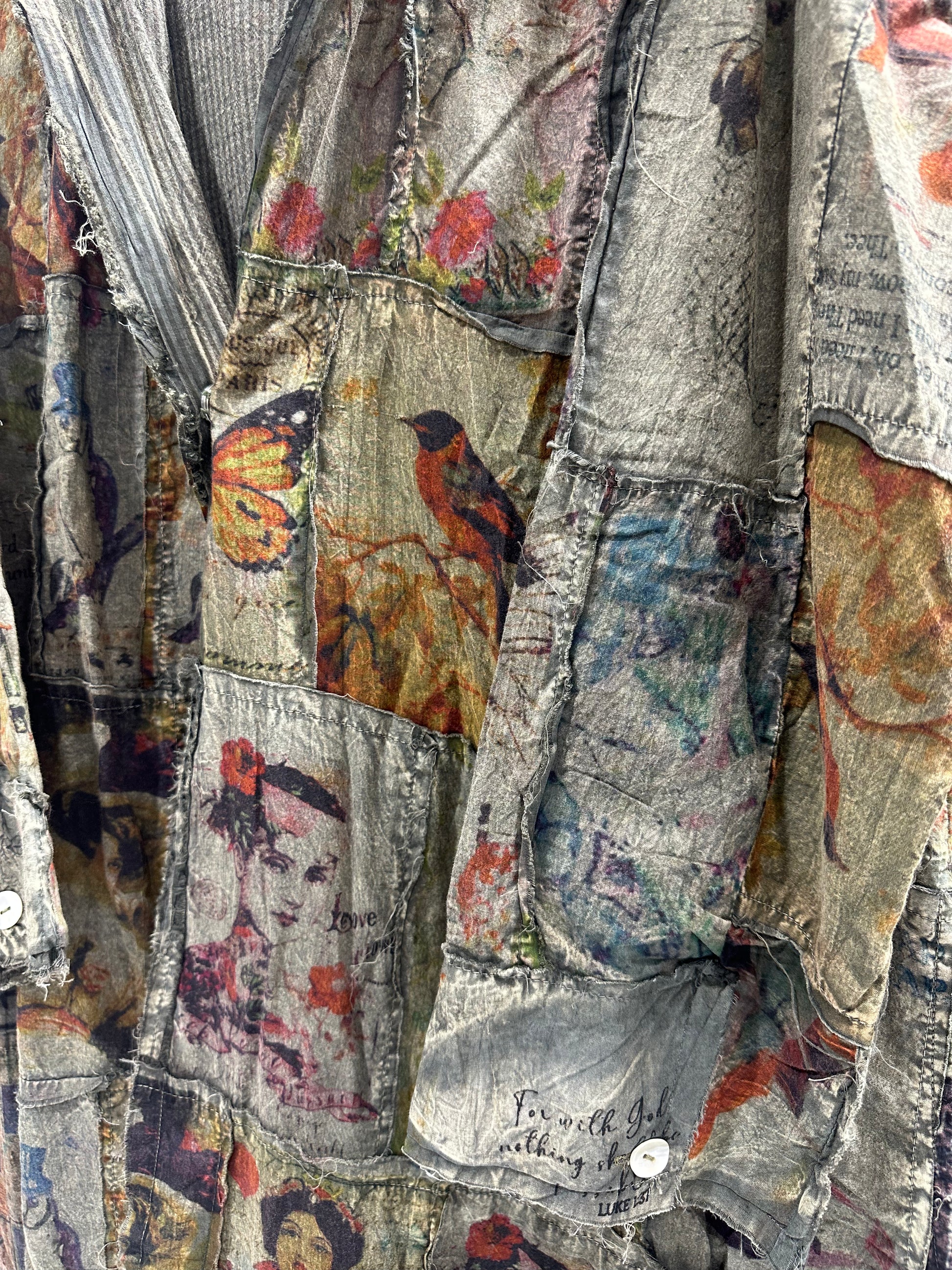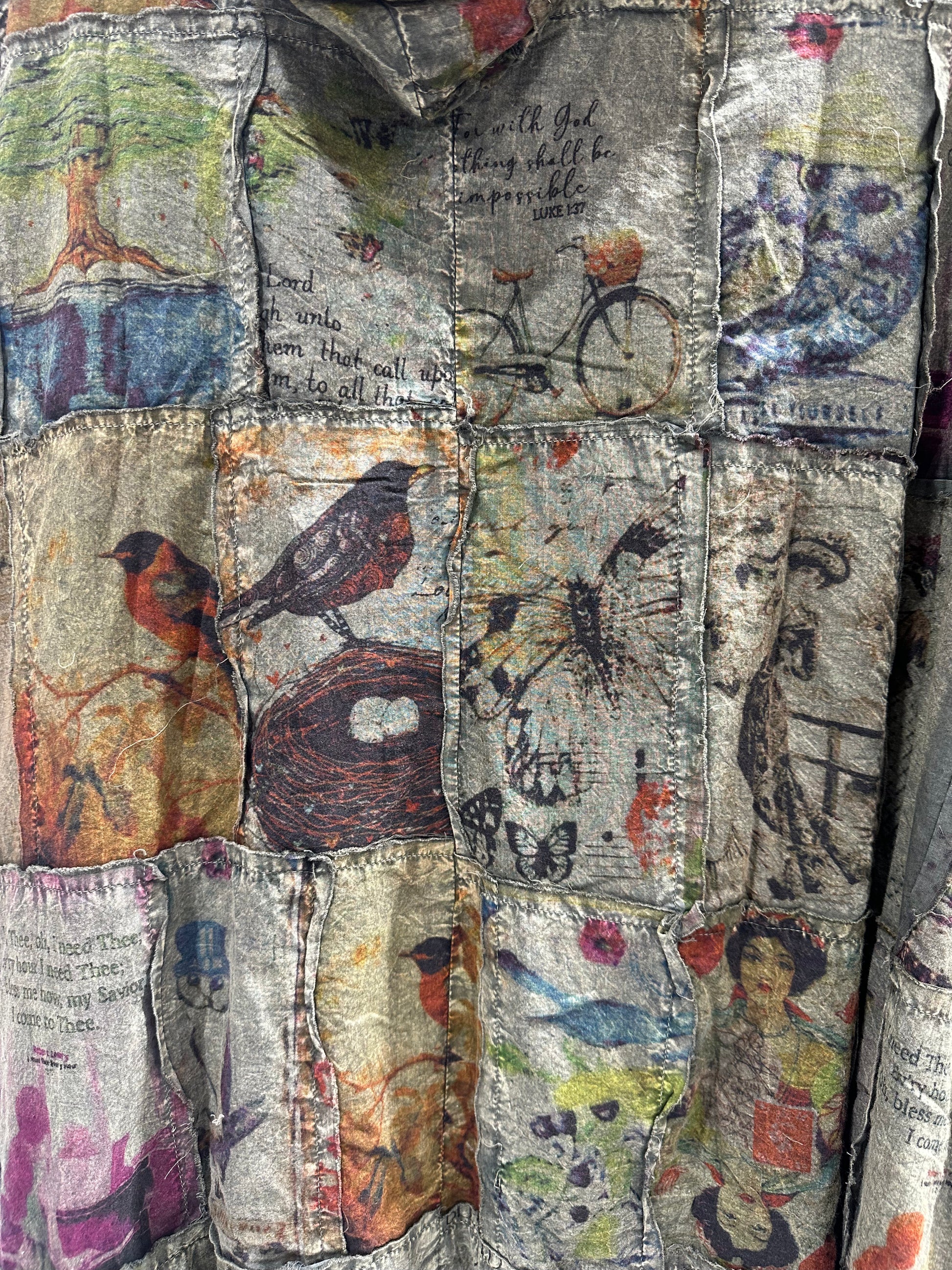 Wrap yourself in effortless artsy charm with this high-low hooded jacket by Paper Lace. A vibrant mix of green and plum patchwork gives it that signature boho-chic personality, while the soft, lightweight fabric makes it a perfect throw-on layer year-round. The relaxed one-size silhouette drapes beautifully, flowing longer in the back for a touch of drama. Finished with a cozy hood and raw-edged detailing, it’s the ideal statement piece for elevating everyday outfits with creative, free-spirited style.