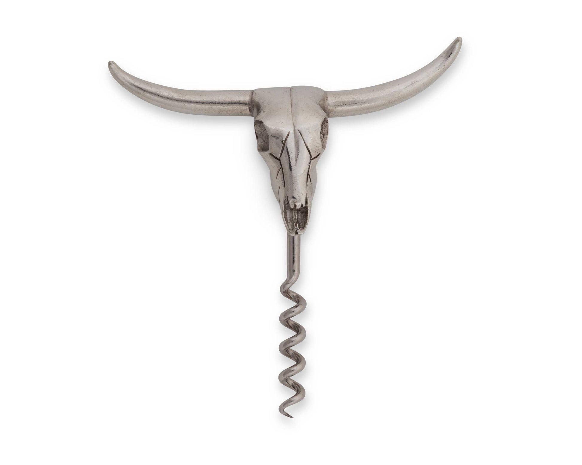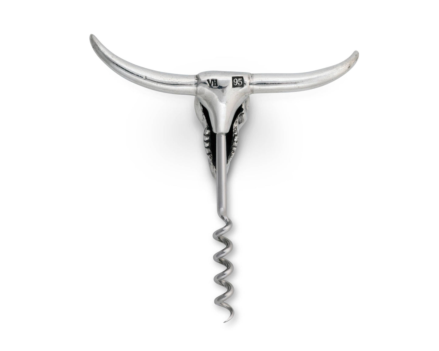 Open a fresh bottle of your favorite red or white with this Vagabond House wine pull. It's affixed with a ranch-inspired silver cow skull that adds a unique element to your tablespace, and the horns are made of aluminum alloy for sturdiness, providing a secure grip with plenty of leverage as you slide the cork out. This wine pull complements your existing rustic-style tableware and makes a great conversation starter with dinner guests. Its long, sharp corkscrew ensures clean contact with the bottle's cork and easy extraction. Use this Vagabond House wine pull at your next festive wine night. It measures just 5 inches long by 4.5 inches wide, so it stores neatly in a kitchen drawer for easy access. Size: 5''L x 4.5''W x 1''T Care: Hand wash recommend - if placing in the dishwasher use low heat and non acidic detergent