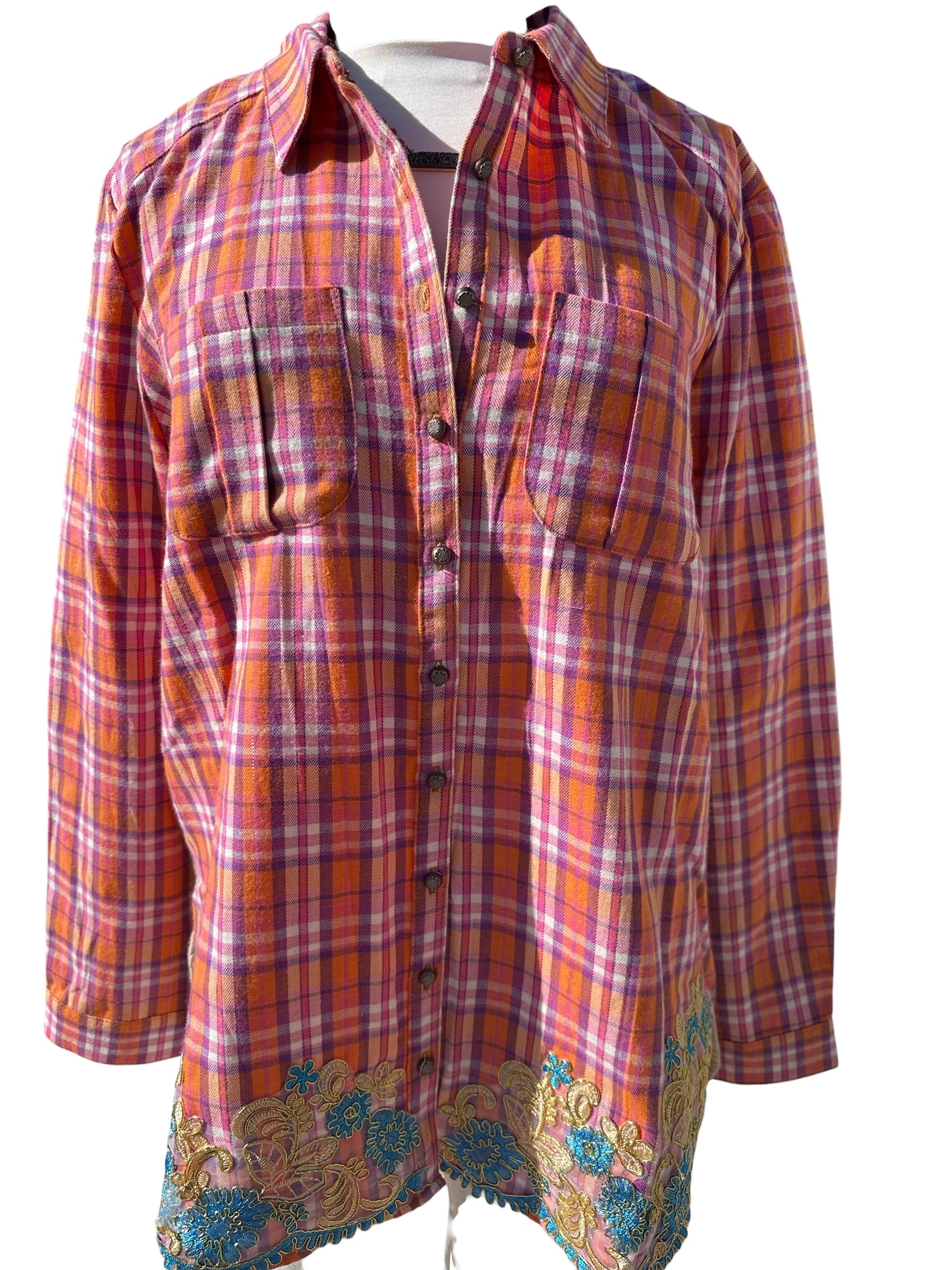- Button-up plaid shirt with contrast embroidered back, 2 front pockets, front hem with floral lace, high-low hem