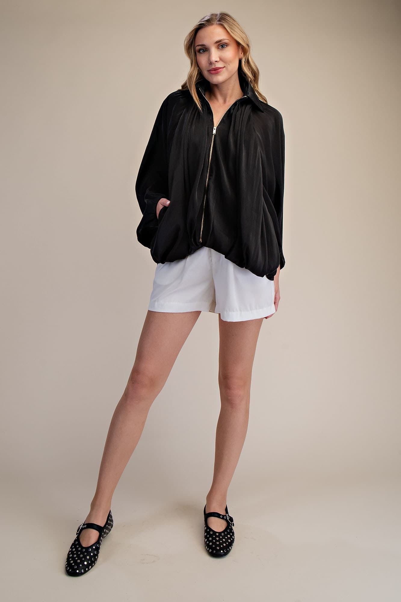 Effortless style meets cozy comfort in this puff bomber jacket. Crafted from soft, fluid fabric, the gathered hem adds a modern twist to a classic silhouette. Perfect for layering on chilly days or throwing over your favorite outfit for an instant vibe upgrade. Whether you're running errands or meeting friends, this jacket keeps you looking put-together and feeling fabulous.
