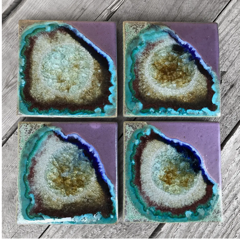 Geode Crackle coasters are made by a skilled group of artisans at our studio in Minneapolis, Minnesota. These square ceramic coasters are handmade, one of a kind, and variation should be expected. Orders of 4 of the same color will be sent in arrangements that compliment each other as sets. Each coaster is one of a kind and unique, but we will happily group similar coaster Each coaster measures approximately 4" x 4" and has felt feet attached to the underside to protect tabletop surfaces.