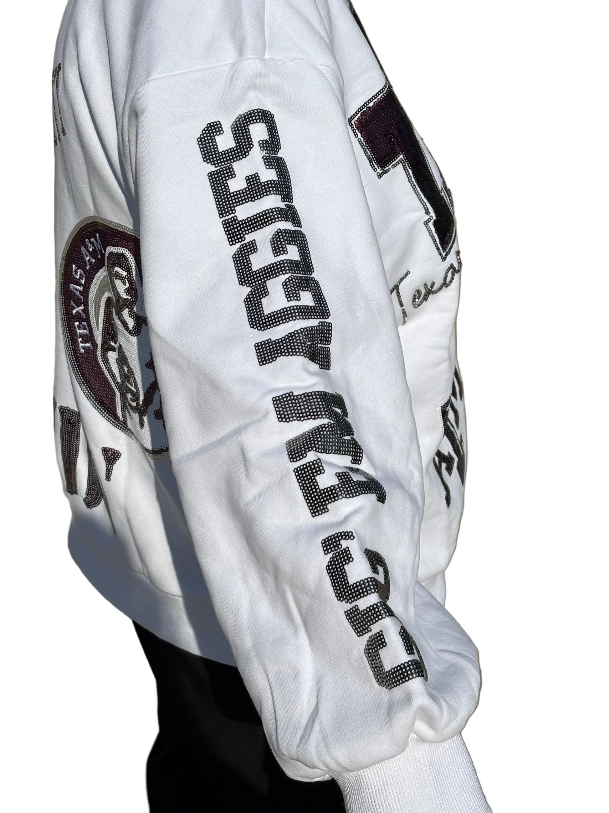 Show your A&M pride with this Licensed big icons scattered all over sweatshirt featuring sparkling jewels and sequins that ring Long Horns and other beloved A&M Icons to Life. Perfect for game day adding a fun glittery touch to your cozy sweatshirt on game day!