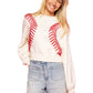 Take me out to the ballgame! Try on this white long sleeve sweater stitched down the front and back with red tinsel... soooo CuTe xo