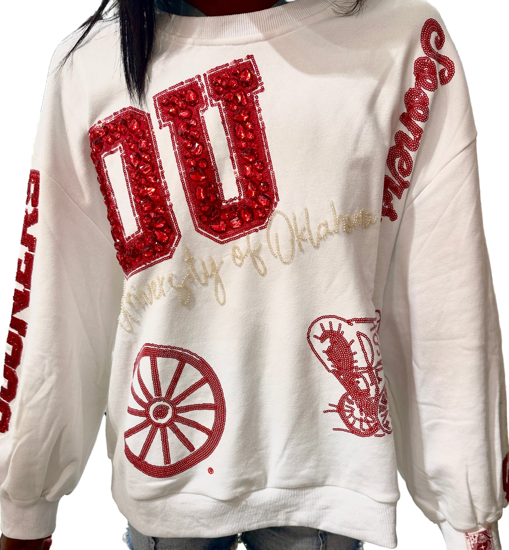 Show your OU pride with this Licensed OU big icons scattered all over sweatshirt featuring sparkling jewels and sequins that bring The Sooners and other beloved OU Icons to Life. Perfect for game day adding a fun glittery touch to your cozy sweatshirt on game day!