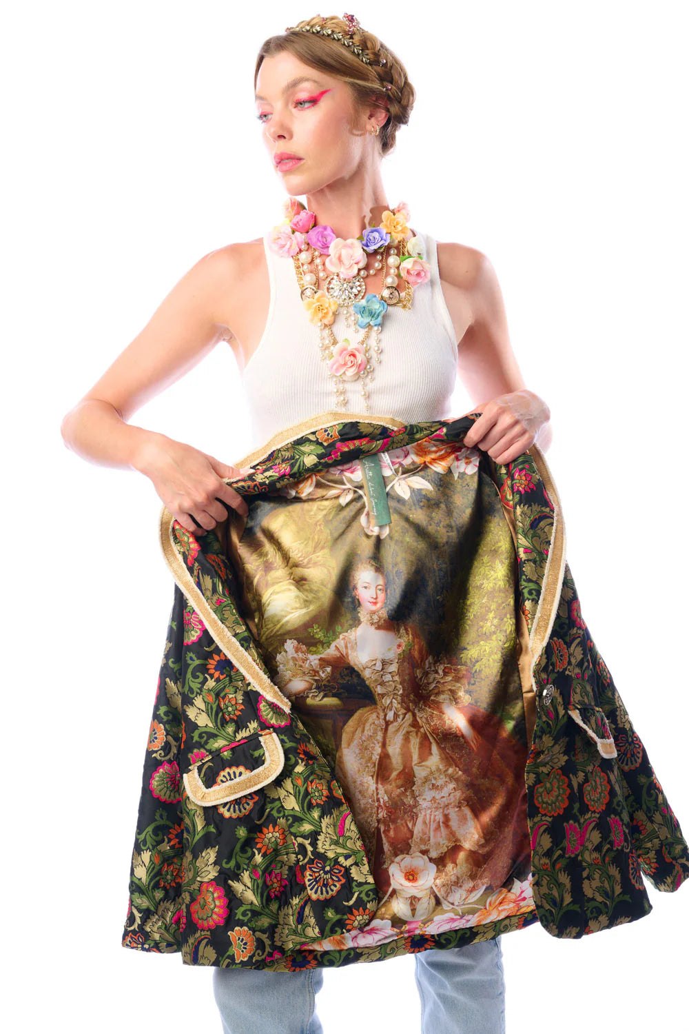 - Floral jacquard silk blend blazer with Francois Boucher Madame De Pompadour print satin lining, metallic gold trim on edge of the collar/lapel & flap pockets, 1 decorative button