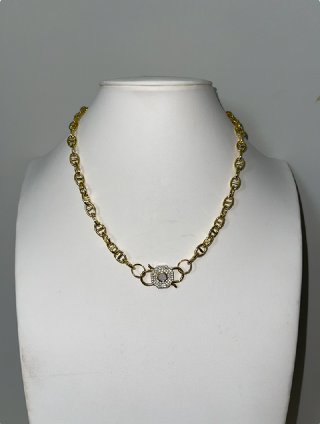 Beautiful 16 inch 14k gold plated chain with Front double clasp. The Clasp has beautiful opal and is encrusted with CZ's.