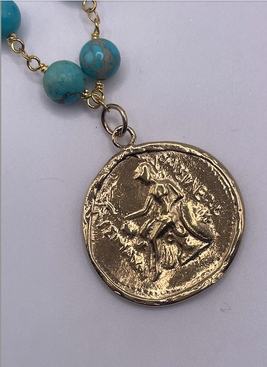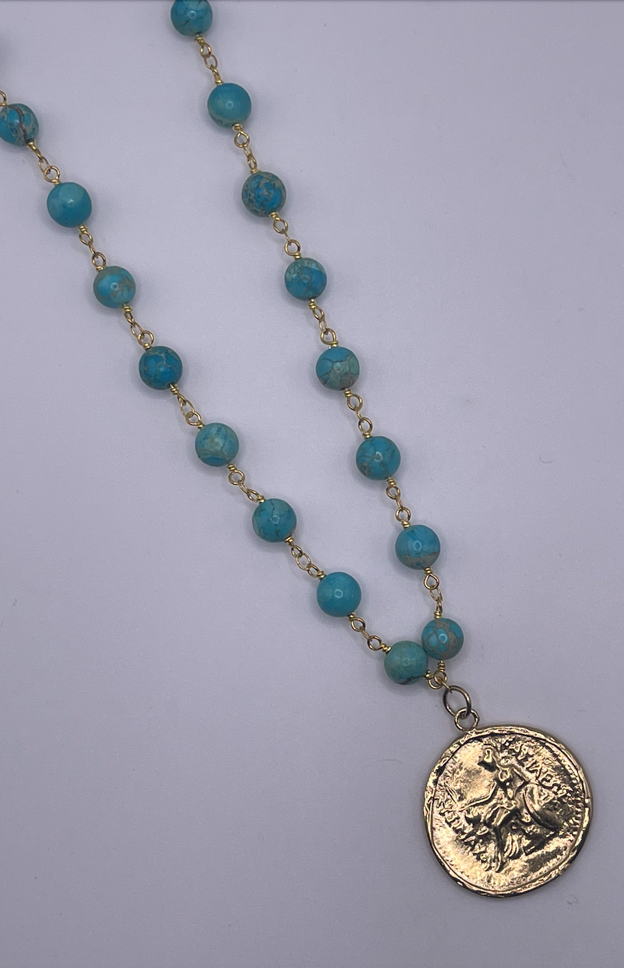 This Beautiful Turquoise Jasper is on a 14K gold plated 18 inch Chain. The 1" Replica Roman Coin is 18K Gold Plated. Great Layering necklace.