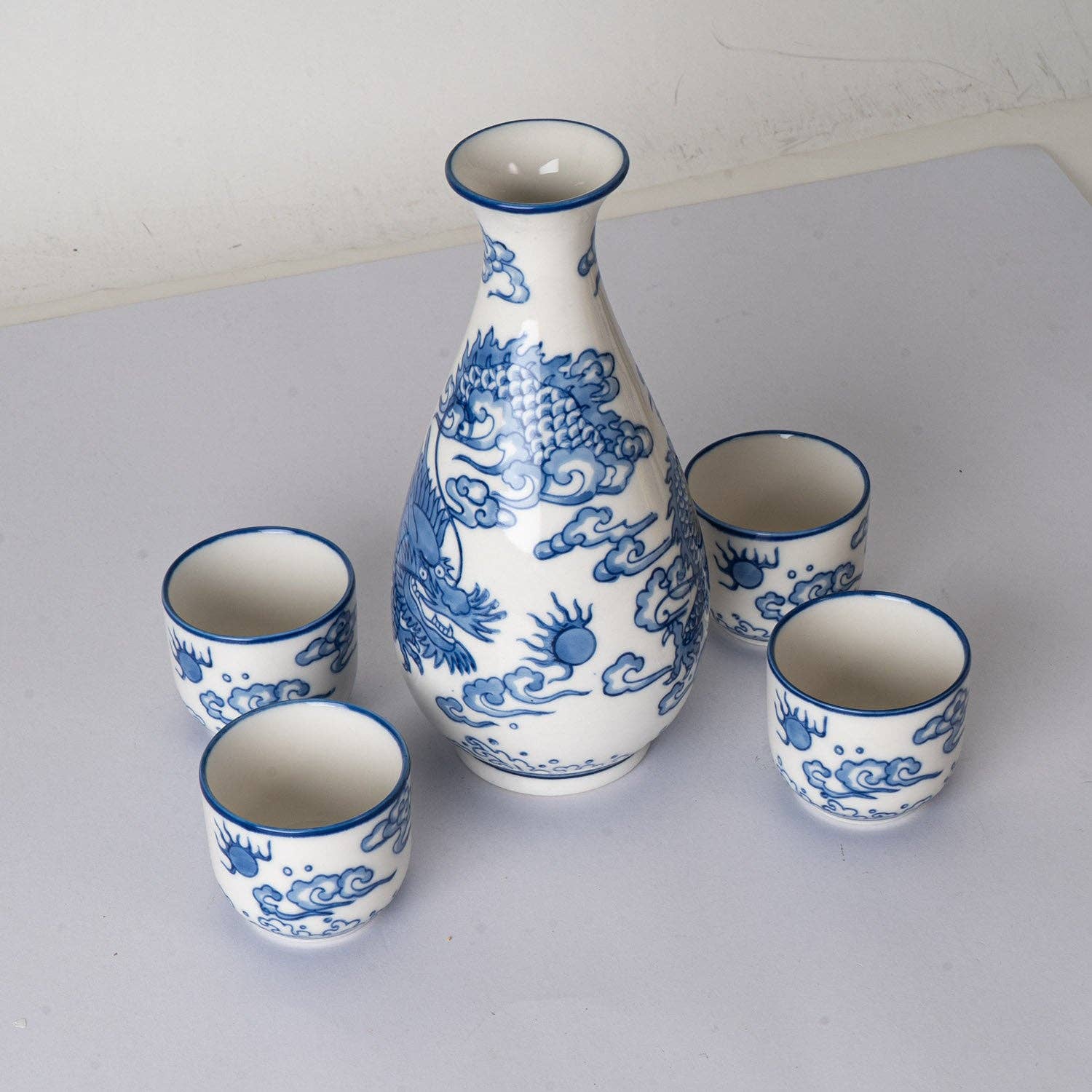 Ryu Dragon Porcelain Glazed 10 oz Sake Bottle and 4 Cups