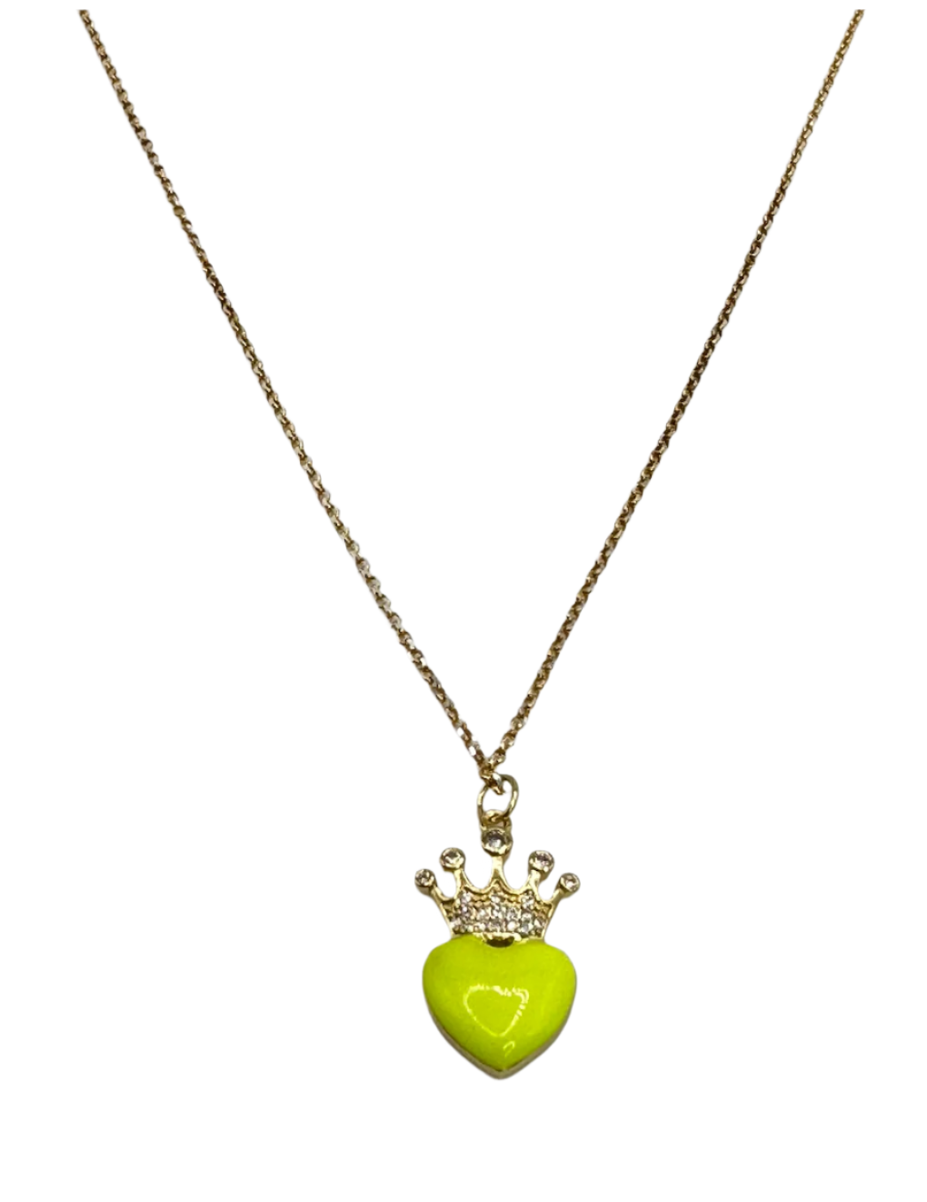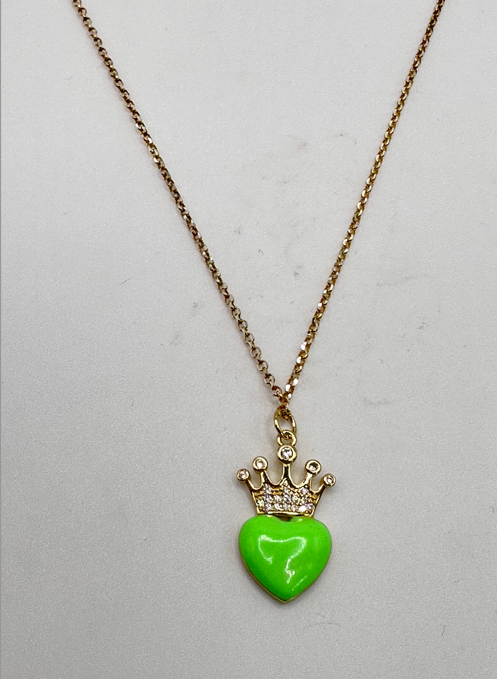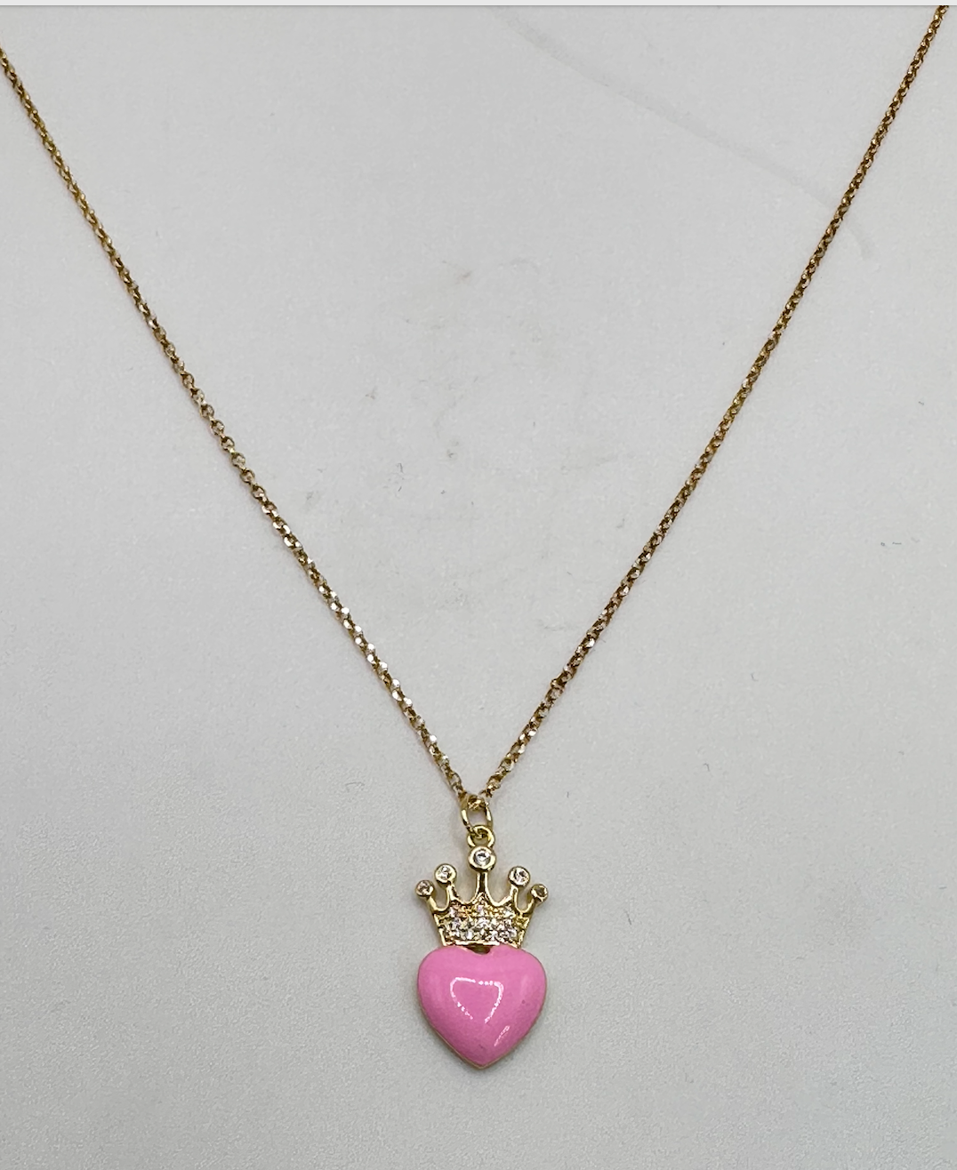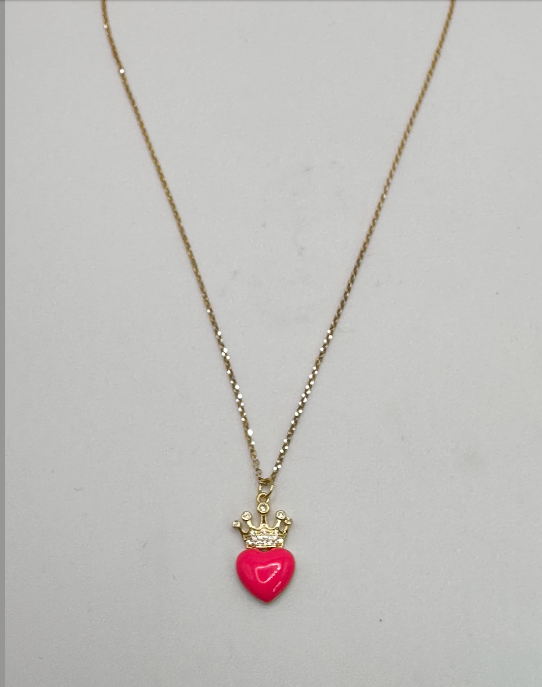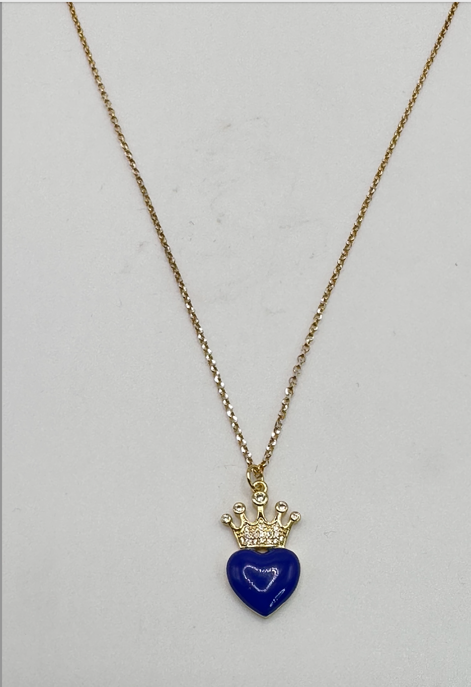 Sarah means "princess". The Chain is a 14k gold pated Dainty Chain. The Enamel Heart Pendant with crown is also 14K Gold Plated. its 16 inches long!!
