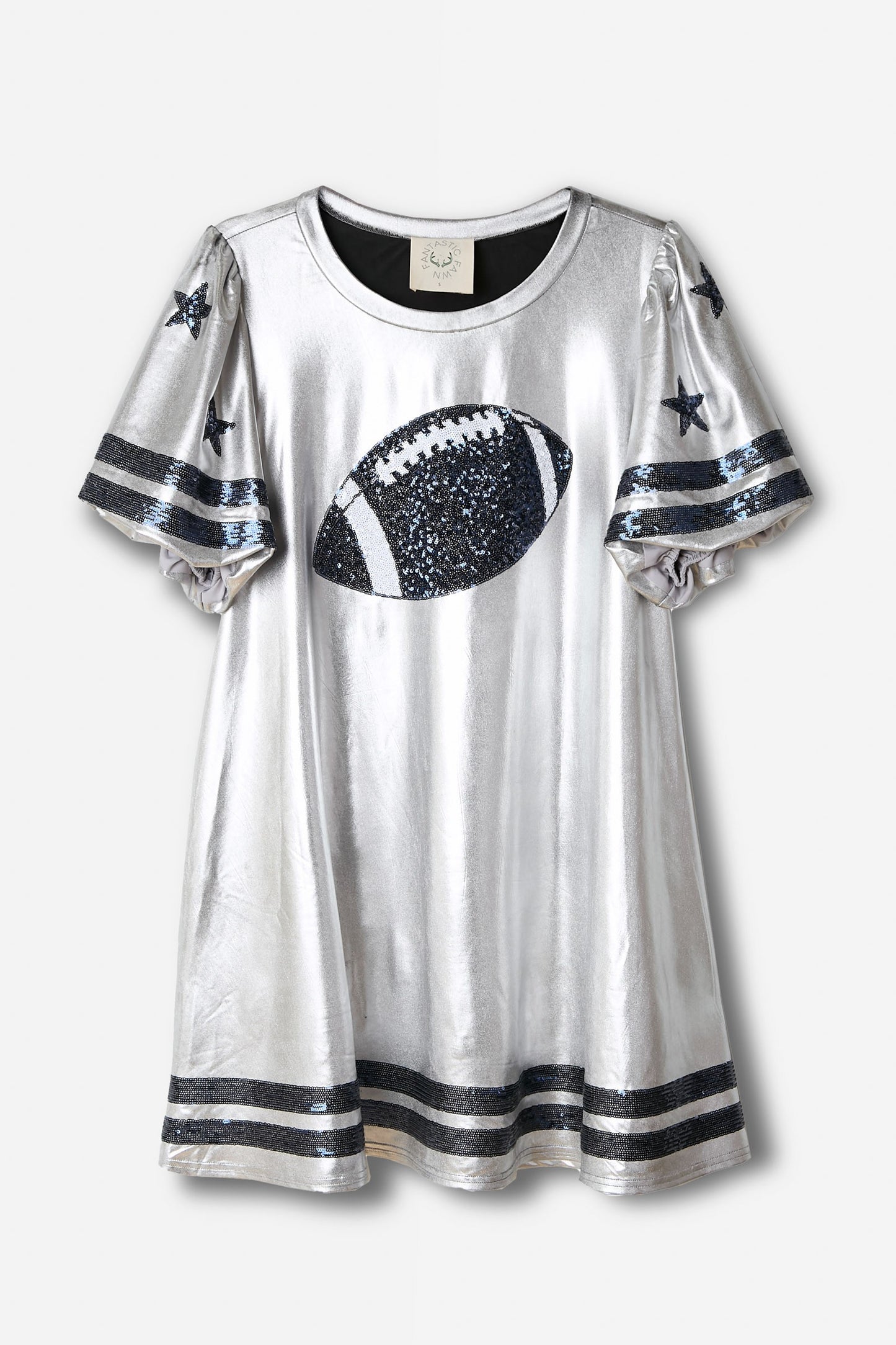 Sequins Football Short Puff Sleeve Mini Dress - Sequin football patch - Round neckline - Short sequin puff sleeves - Loose fit
