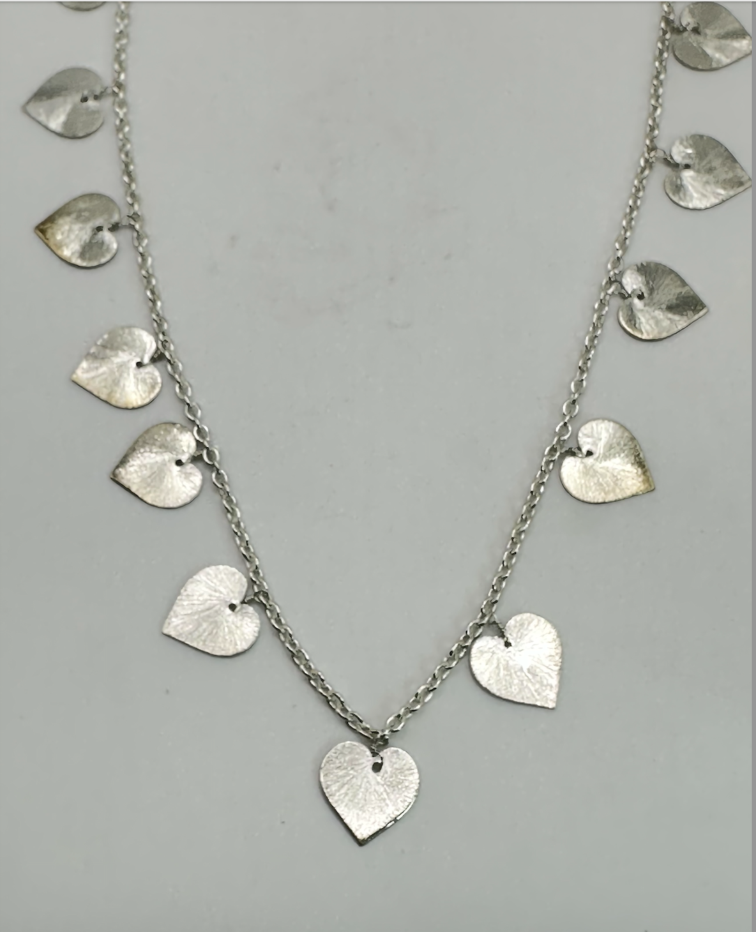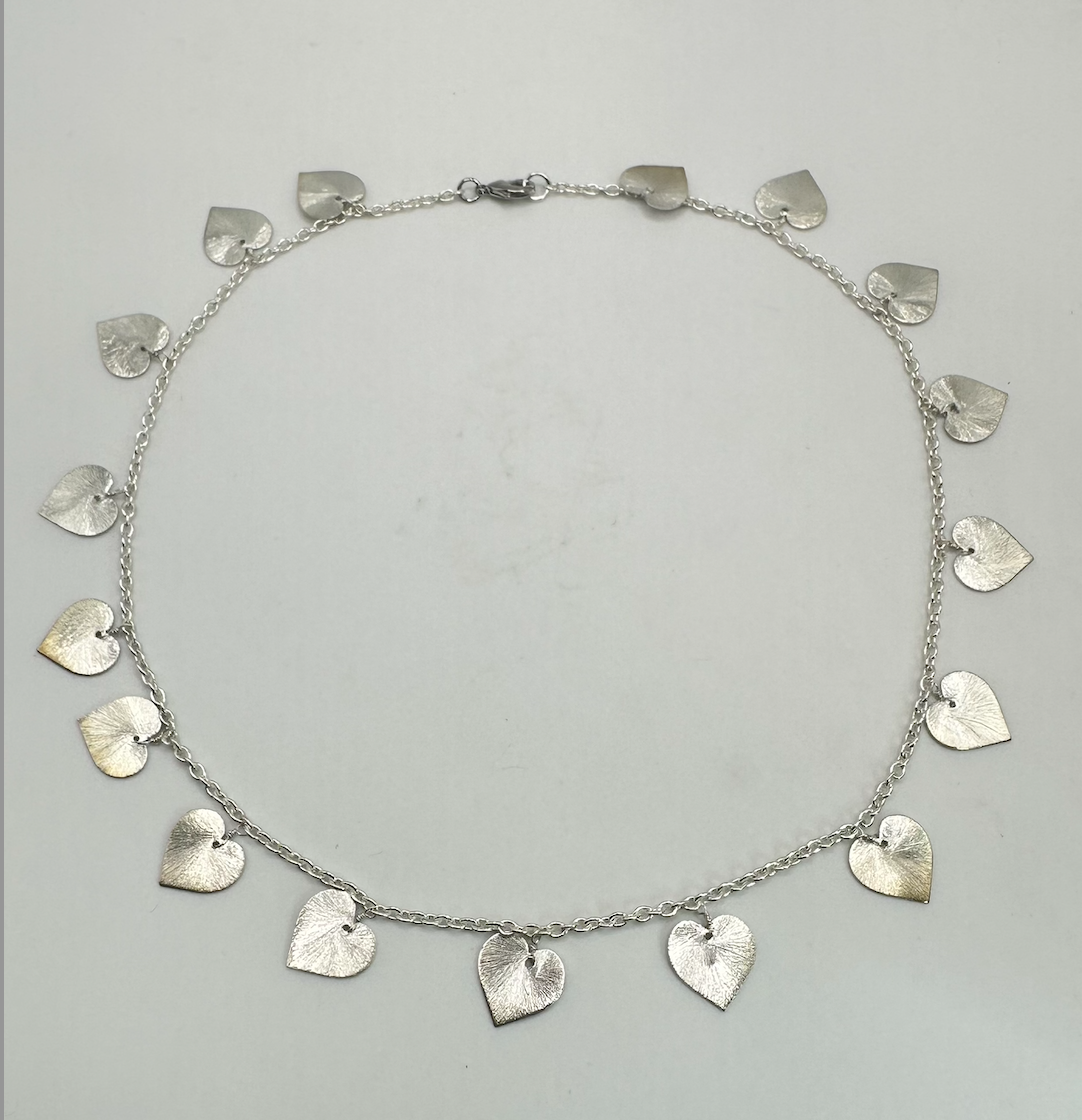 The hearts are about 1/2 inch across and top to bottom. This also comes in a 18 inch Necklace and a 7 or 8 inch Bracelet.