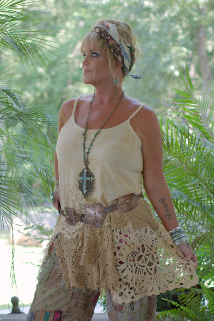 The Jaded Gypsy Squared Away Tank Top is effortless boho at its best. Crafted in soft, washed neutral tones, this flowy tank features delicate spaghetti straps and a relaxed, easy silhouette. Intricate crochet and lace patchwork detail the lower half, creating beautiful texture and a one-of-a-kind, artisanal feel. The asymmetrical, layered hem adds movement and a touch of whimsy, making every piece uniquely charming. Perfect for layering or wearing on its own, this tank pairs beautifully with denim, linen pants, or a free-spirited skirt for that signature Jaded Gypsy vibe.