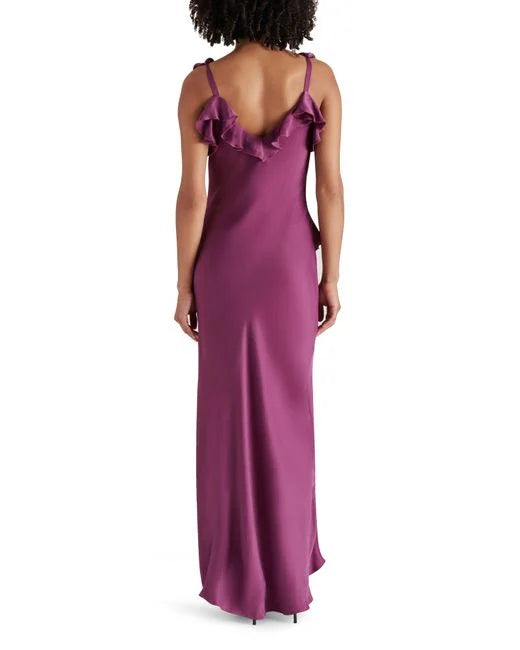 Be the center of attention in the stunning ADALINA dress.  This deep purple satin dress features a v-neckline and ruffle detail that will make you stand out on any occasion. With its sleeveless design, this multicolor maxi dress is the perfect addition to your  wardrobe.