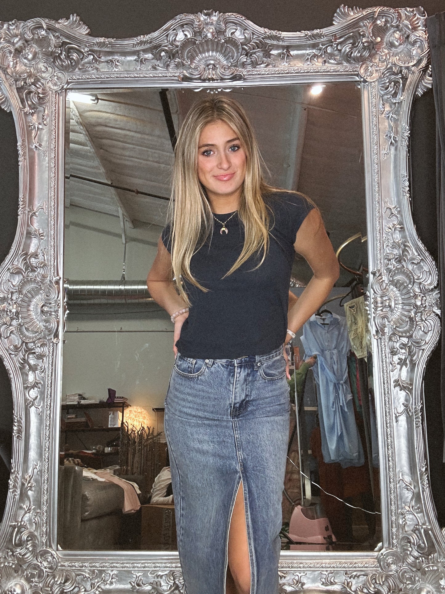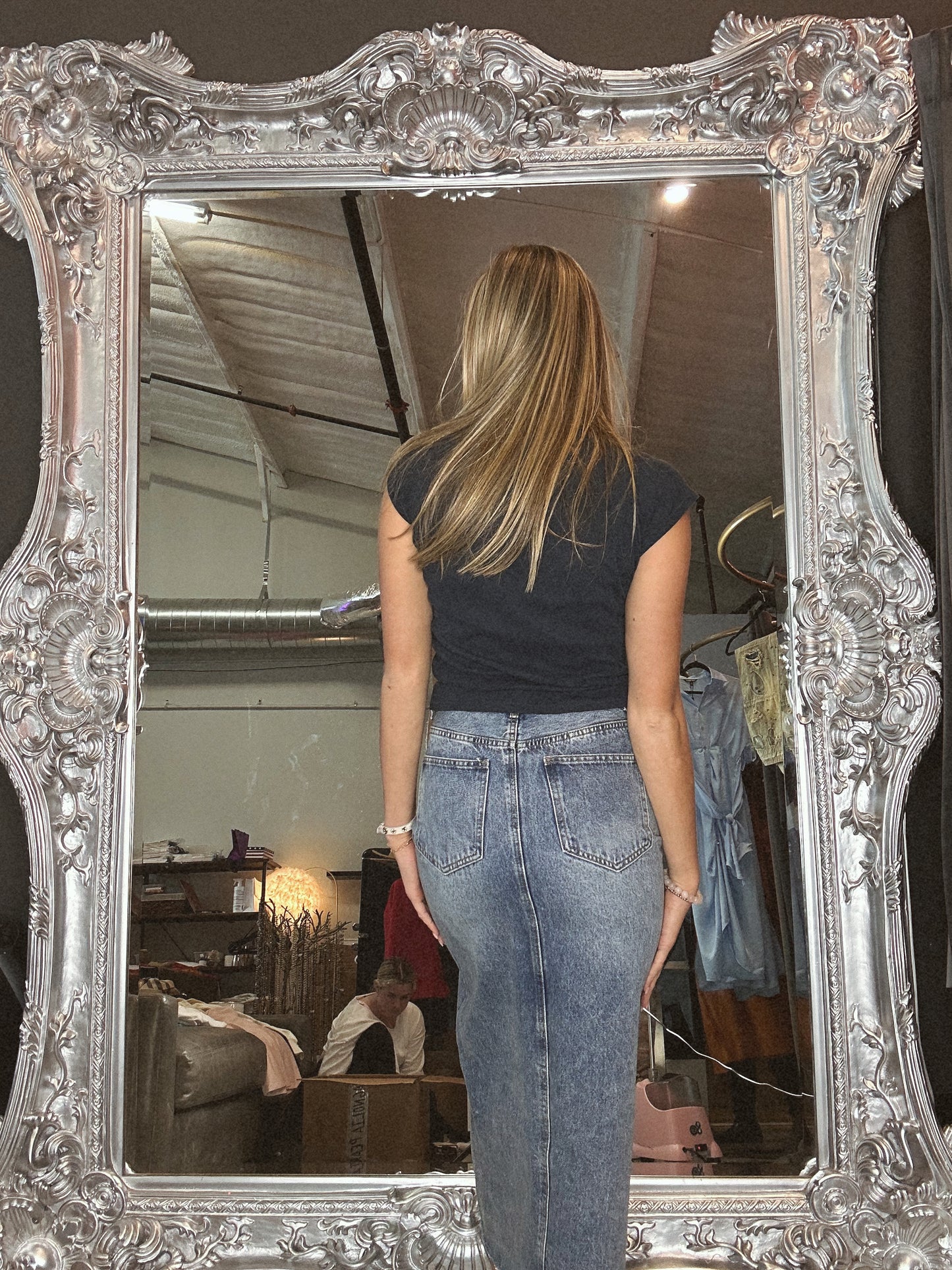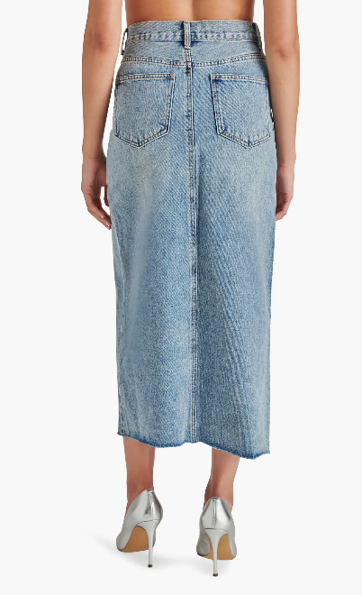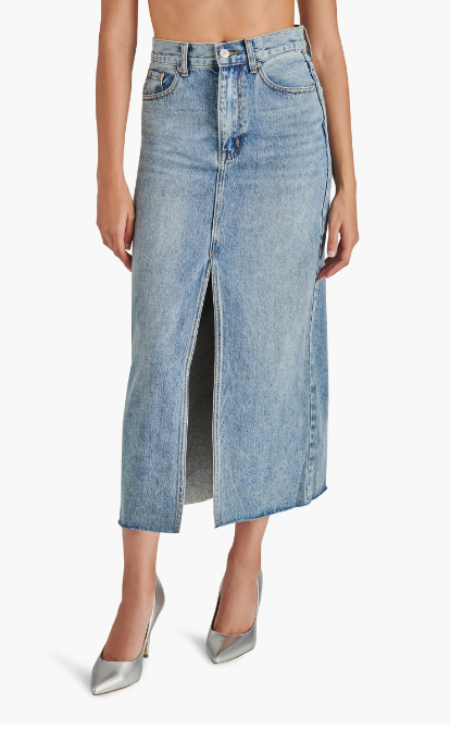 A single front slit gives you room to move in this long skirt cut from nonstretch denim in a classic light-blue wash.