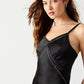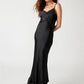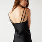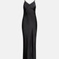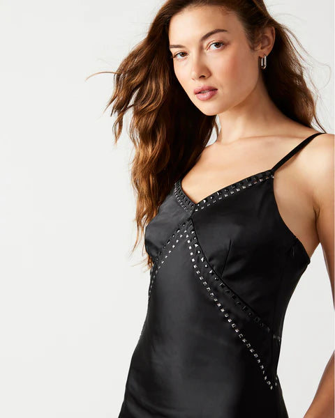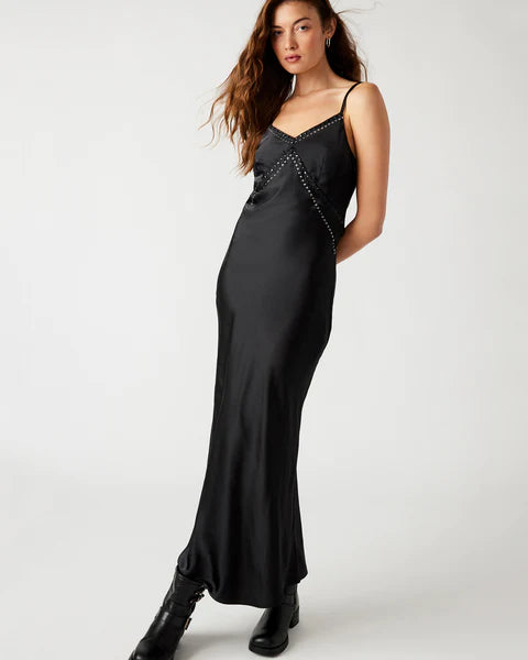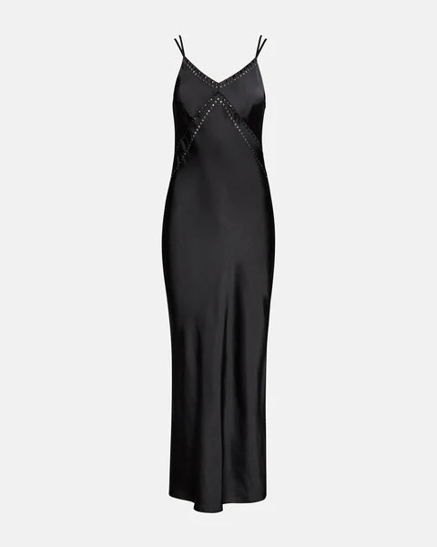 REESE is a silky satin maxi slip dress set with metallic studs along the neckline and the bust, highlighting subtle shaping seams in the design.