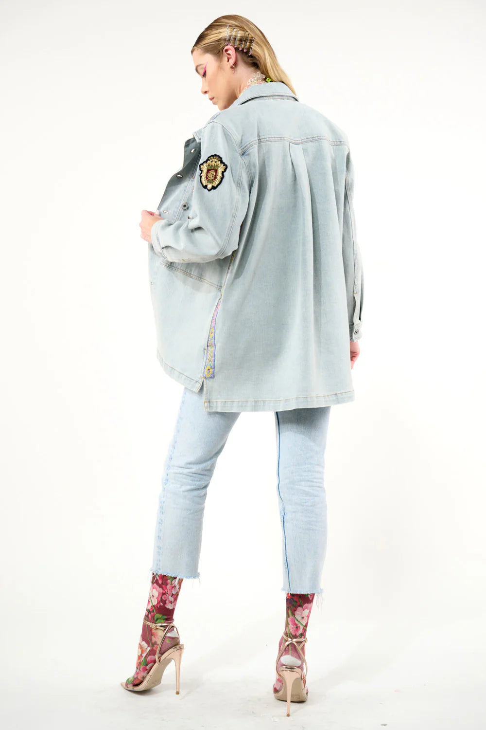 - Denim washed button-up jacket, 1 front flap pocket with brooches pinned to the pocket flap and ribbon badge pinned to the pocket, 1 crystal badge attached above the pocket, 1 royal badge attached to the upper left sleeve, sides with jacquard trims. slight slits on side, 2 side pockets