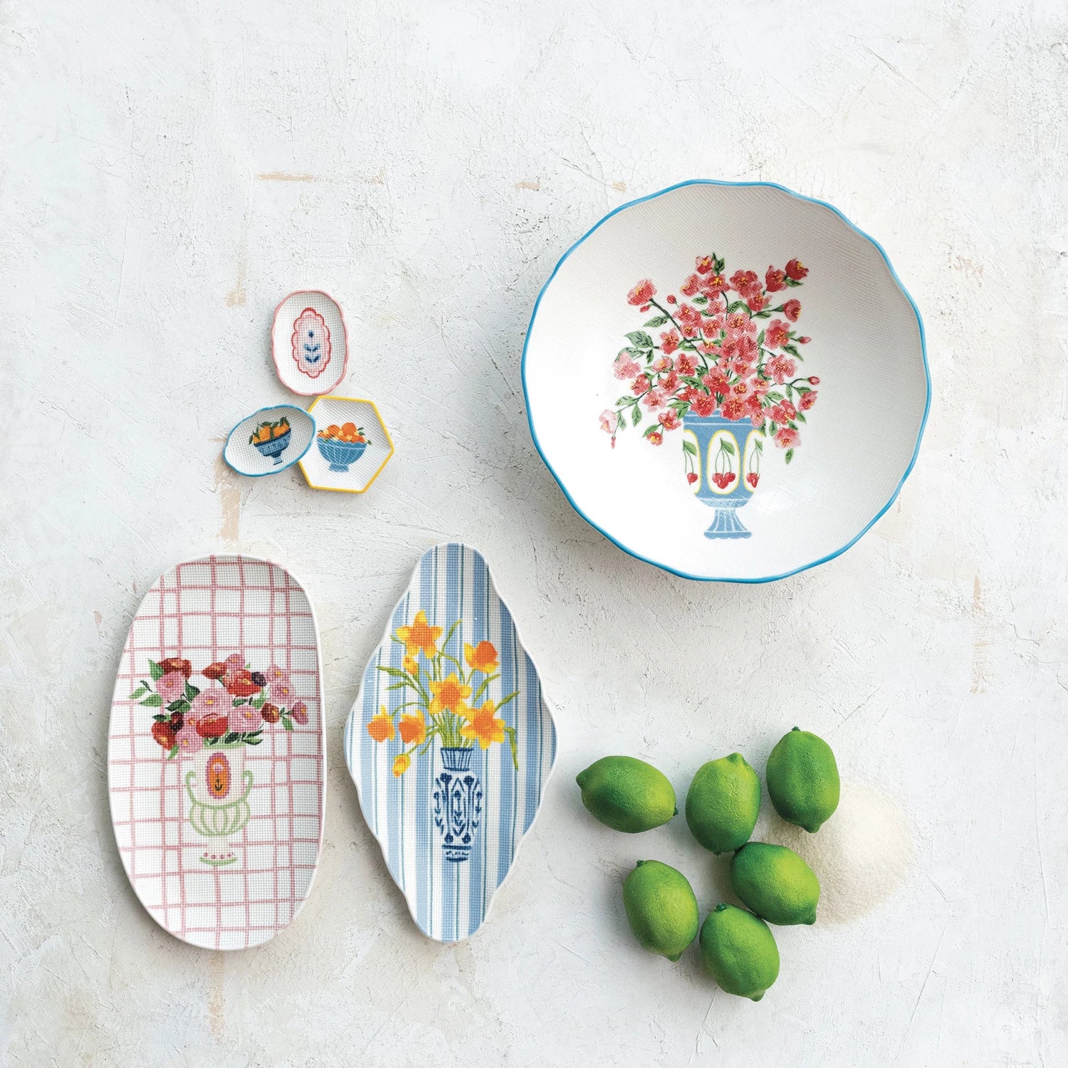 Bring a touch of old-world charm and cheerful color to the table with these textured stoneware plates, each featuring a hand-illustrated floral arrangement displayed in a classic vase motif. Soft pastel hues, gentle patterns, and a subtly textured surface give these plates a collected-over-time feel that’s both timeless and fresh.