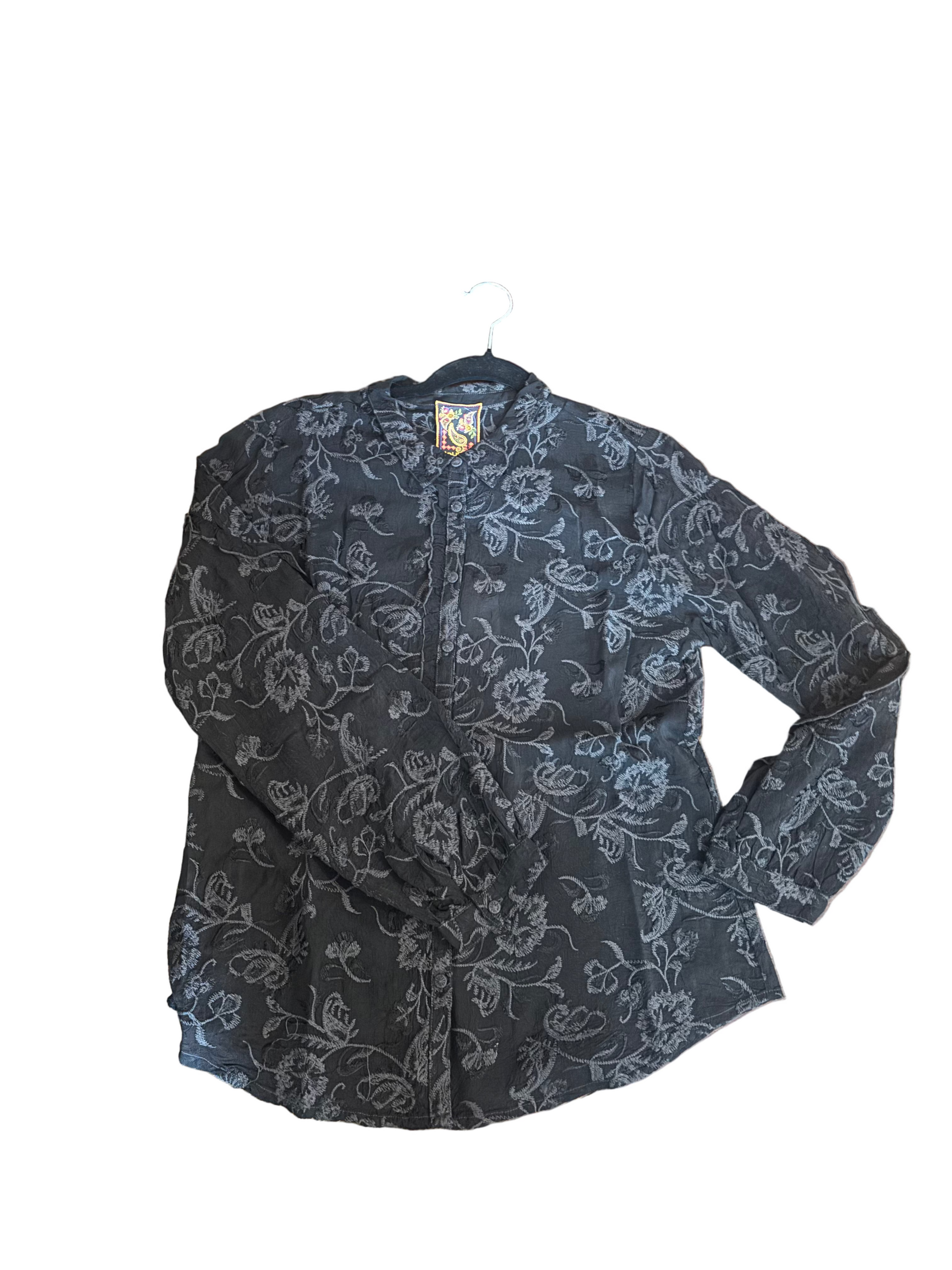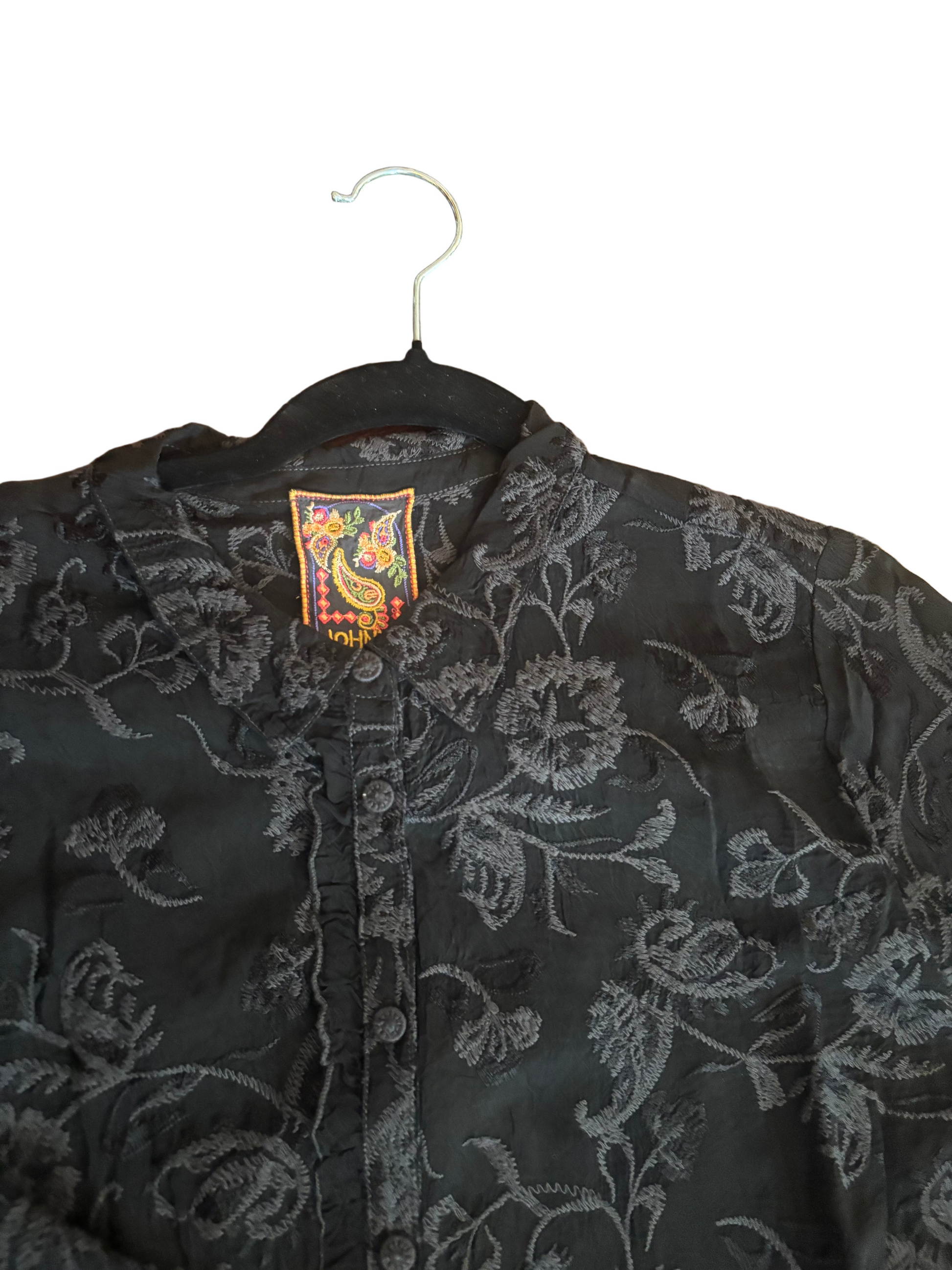 Embroidered floral designs on a vibrant Black Color, the Elain Favorite Button Front Shirt is an eye-catching wardrobe addition. Crafted from a lightweight fabric with a hint of stretch, this button-front shirt is finished with split cuffs for a tailored look. Pair with coordinating trousers and kitten heels for a fresh take on office wear.