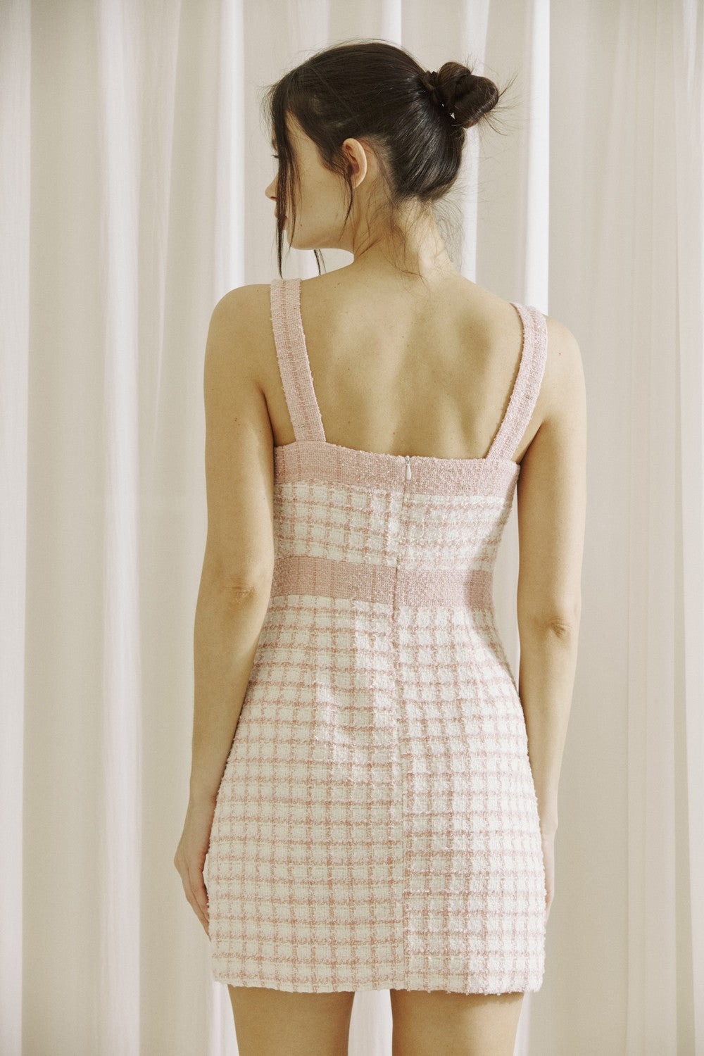 White pink check tweed and pearl bodycon mini dress. It exhibits a straight neckline, a Black color block on the grey, and bust darts. It also has a fitted silhouette, tank straps, front bottom pockets, and a back invisible zipper. Storia