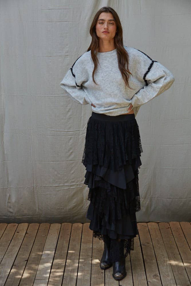 | Knit Sweater Stitch Detailed Crew Neck Pullover : Light Heather Grey