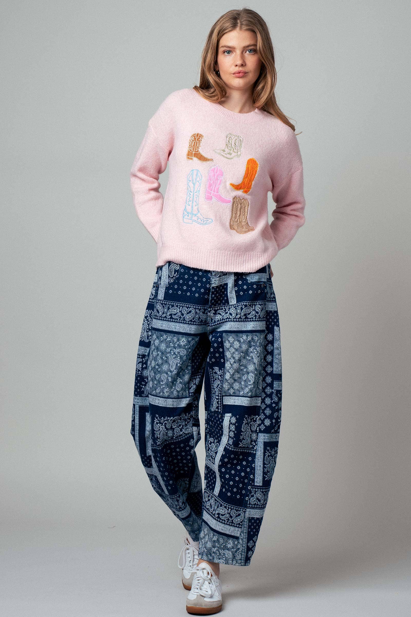 Add a western-inspired twist to your cozy wardrobe with this playful knit sweater. Crafted from a soft knit, its relaxed fit is brought to life by vibrant embroidered cowboy boots in a rainbow of colors. This piece combines a classic crewneck silhouette with fun, eclectic energy. • Material: 65% Polyester, 13% Acrylic, 13% Nylon, 6% Wool, 3% Spandex • Design: Features vibrant, colorful cowboy boot embroidery • Fit: True to size with an easy, relaxed drape • Details: Classic crewneck with ribbed neckline, cuffs, and hem